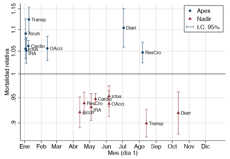 Fuente: Elaboración propia a partir de las bases de microdatos de defunciones disponibles en la web del Centro Centroamericano de Población (CCP, 2018).Para los ocho grupos de causas de muerte cuyos ápex y nadir de estacionalidad son significativos (diferentes de 1), la Gráfica 5 muestra la fecha en que ocurren estos dos extremos y su magnitud, incluyendo el IC. Se observa una aglomeración de causas con ápex de mortalidad a principios de año y otra aglomeración de causas con mortalidad mínima alrededor de mayo. La mortalidad por diarreas, escapa a ese patrón estacional. El máximo ocurre a principios de julio y el mínimo a mediados de octubre. También la mortalidad por enfermedades respiratorias crónicas, como enfisema y asma, tiene un máximo peculiar a principios de agosto, en tanto que las muertes en carretera tienen un mínimo peculiar a mediados de agosto.