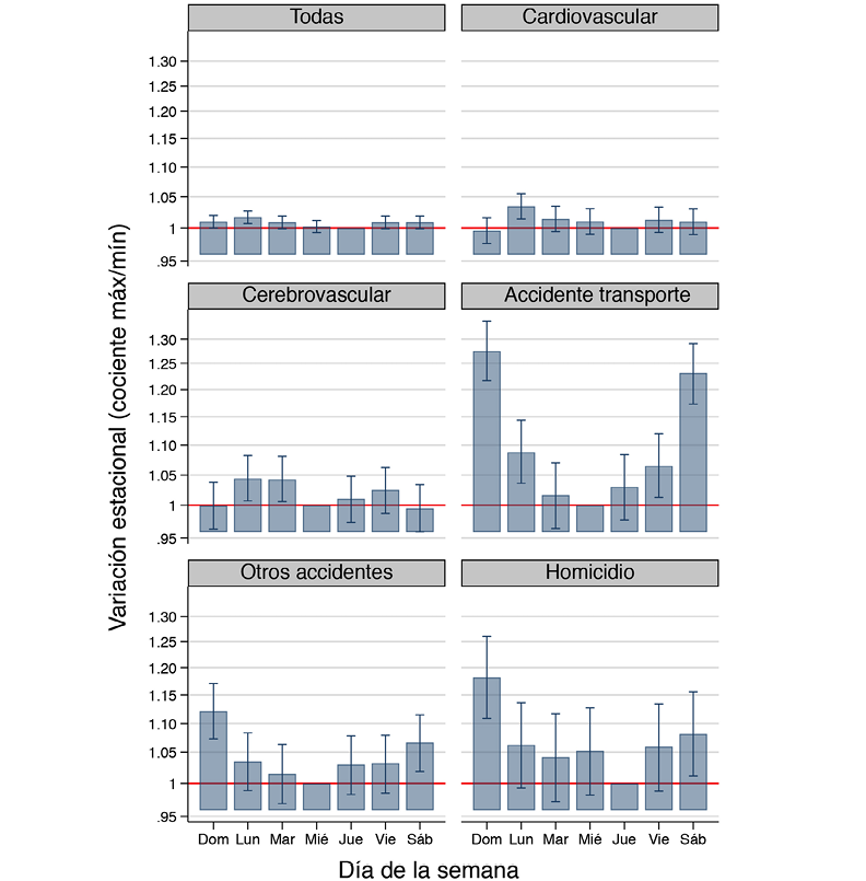 Las variaciones cíclicas anuales pueden deberse a factores de comportamiento de las personas o a variaciones cíclicas en el medio ambiente, principalmente climáticas. En contraste, las variaciones cíclicas semanales probablemente se deban solamente a factores de comportamiento. Para explorar, aunque solo sea de una manera indirecta, la importancia de los factores conductuales en la variación cíclica, se calculó la mortalidad relativa en los siete días de la semana. La Gráfica 6 muestra los resultados para todas las causas de muerte y para cinco grupos de causas de defunción en que se manifestaron variaciones intrasemanales estadísticamente significativas. Para todo tipo de defunciones, el lunes aparece como el día más letal, con un 2 % más muertes que el mínimo de los jueves. Los lunes también son más letales para las enfermedades cerebro- y cardiovasculares, con 4 % de sobremortalidad, la cual en el caso de los ictus se extiende también al día martes. En cambio, en los tres grupos de causas de muerte violenta con variabilidad significativa, el día domingo es el de mayor sobremortalidad: en comparación con los mínimos de miércoles o jueves, los lunes hay 28 % más muertes por accidentes de transporte (también destacan los sábados con 23 %), 12 % más por otro tipo de accidentes, y 18 % por homicidios. Los ciclos intrasemanales en estos tres grupos de muertes violentas aparecen claramente más pronunciados que en otras causas de muerte.