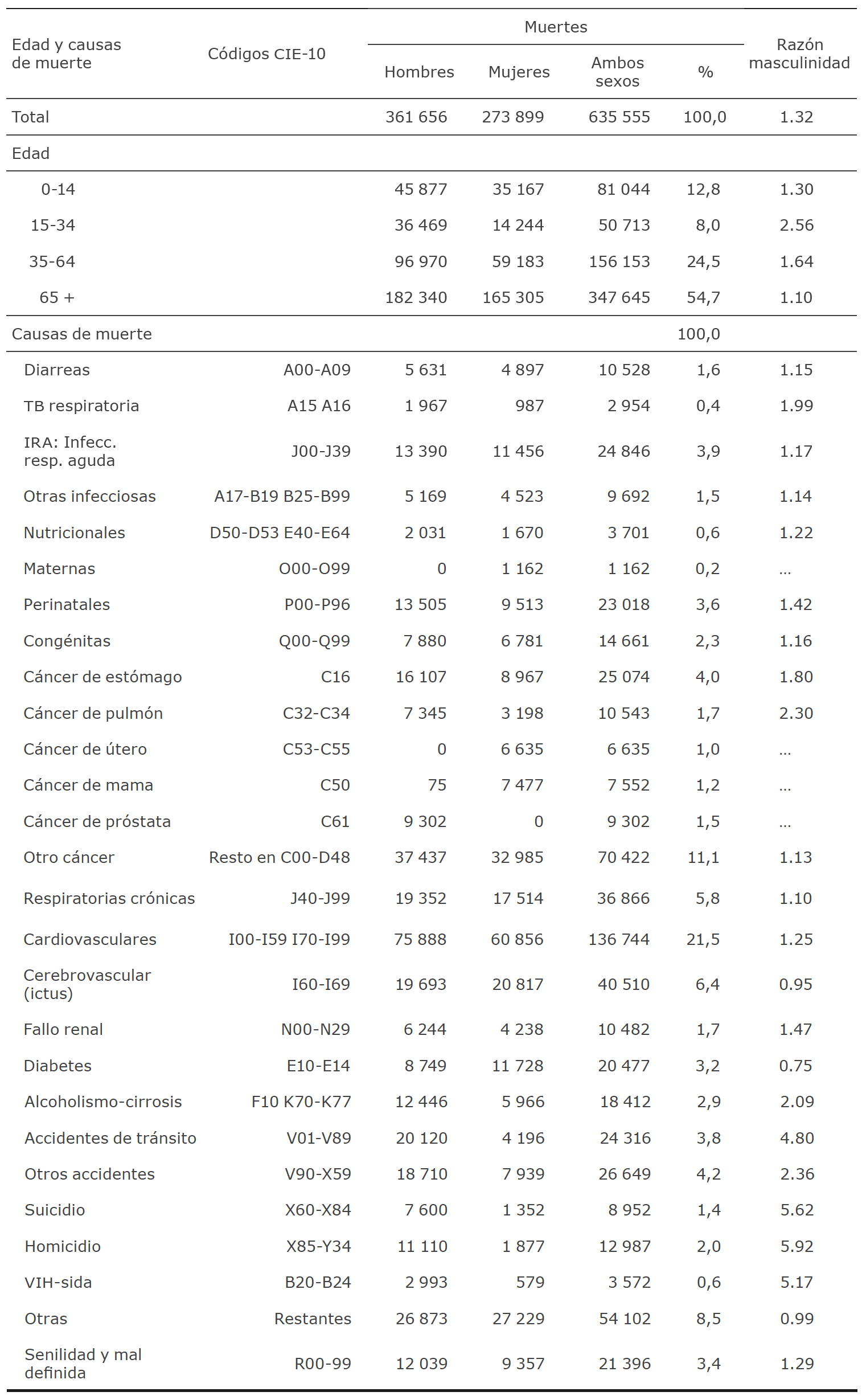 El cuadro 1 muestra el número de observaciones (defunciones) según las variables en estudio. Más de la mitad de las defunciones son de personas mayores de 65 años de edad. Las frecuencias son substancialmente más pequeñas en los otros tres grupos de edades menores, en los que, por tanto, se dispone de un menor poder estadístico para detectar variaciones estacionales. Los veintiséis grupos de causas de muerte son muy disímiles en sus frecuencias. El grupo más grande (enfermedades cardiovasculares) comprende 137 000 defunciones, comparado con el más chico (muertes maternas), con solo mil defunciones. En términos generales, para grupos de causas de muerte con menos de 10 000 observaciones no es probable que se identifiquen cocientes significativos de estacionalidad, a menos que la amplitud de esta sea muy pronunciada.