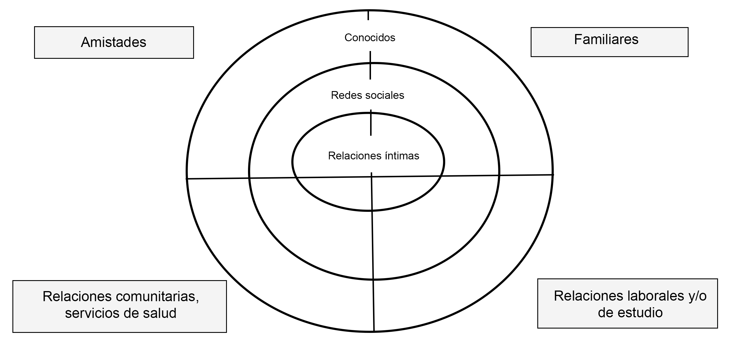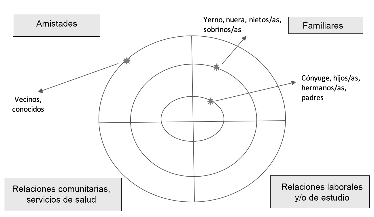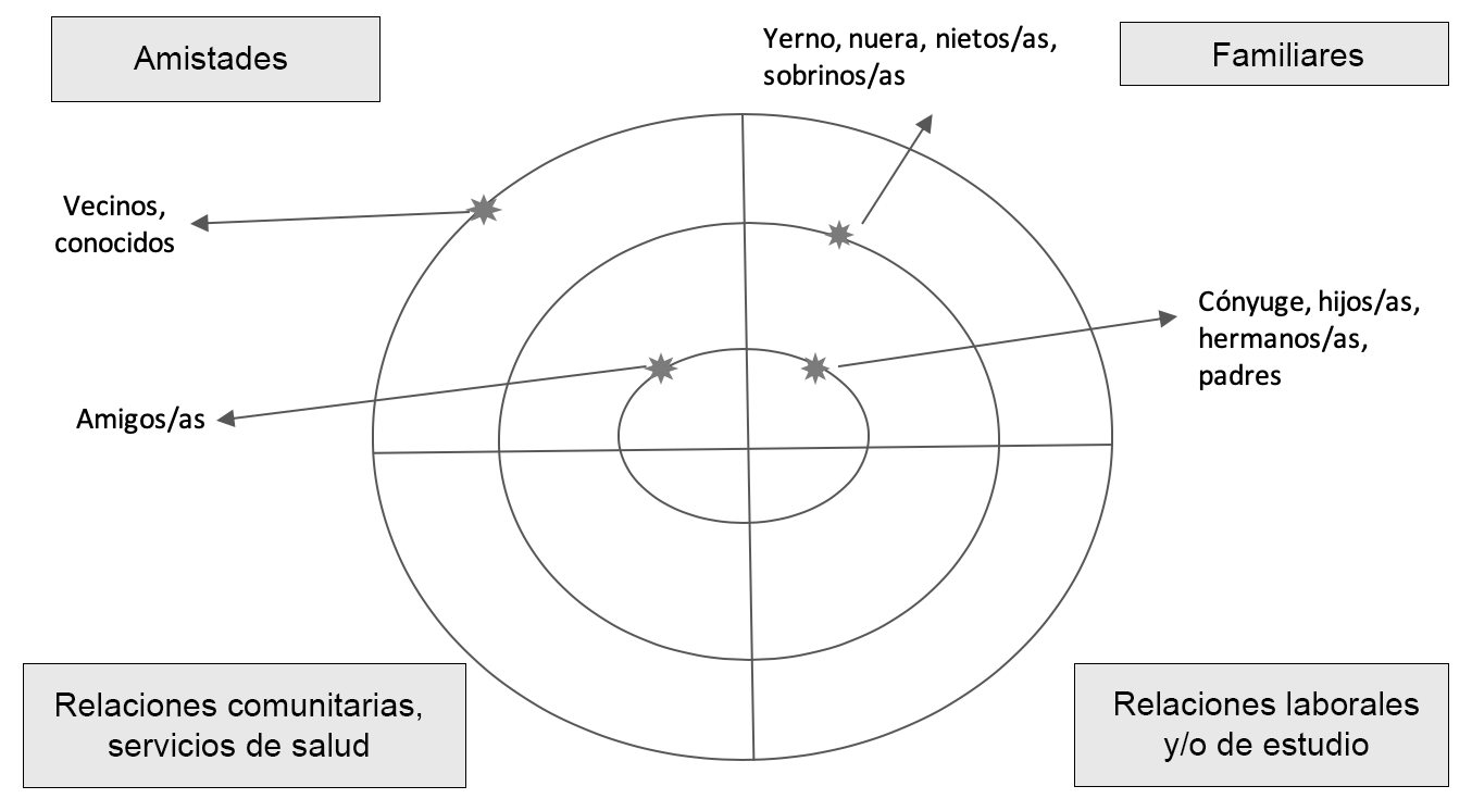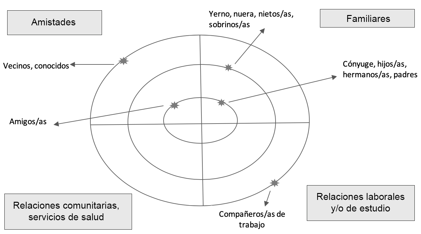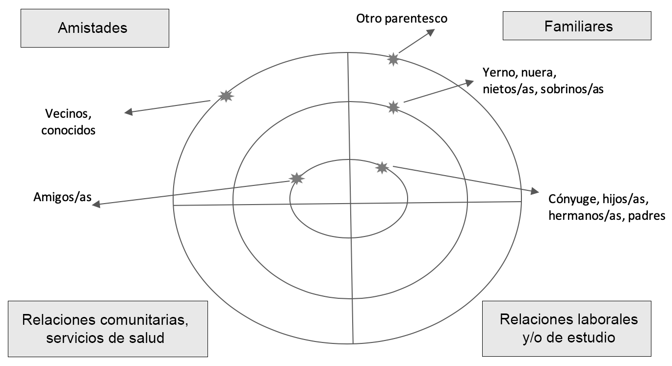 El grado de distribución de la red permite conocer las relaciones y los niveles de intimidad de las personas mayores con sus distintos vínculos con la familia, amistades, el trabajo y la comunidad. Este mapa de red que se presenta en la Figura 1 fue propuesto por Sluzki (1996), en el cual el círculo interior se refiere a las personas con relaciones más íntimas (familiares directos y amigos cercanos); en el círculo intermedio se encuentran las personas con las que se tiene algún contacto, pero no intimidad (familiares intermedios, distintas relaciones sociales), y en el círculo externo están los vínculos con personas conocidas y relaciones ocasionales (vecinos, familiares lejanos, compañeros de escuela o trabajo, conocidos) con los que se tienen relaciones más lejanas.