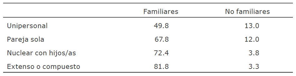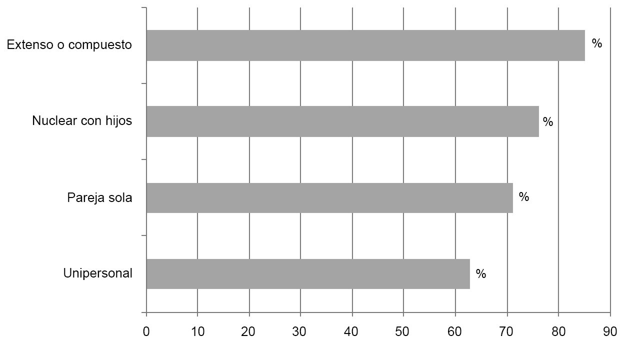 Al calcular el porcentaje de personas mayores que recibe algún tipo de apoyo informal se obtuvo que este es del 71.7. Distinguiendo por tipo de hogar, las personas mayores que residen en hogares extensos o compuestos reciben más apoyo en comparación con quienes viven en otro tipo de arreglo, siendo el hogar unipersonal el que presenta los niveles más bajos (Gráfica 1). Cabe destacar que cuando se distingue la fuente de apoyo, se encuentra que las personas en hogares nucleares con hijos/as y en hogares extensos reciben en mayor medida apoyo de sus familiares. A su vez, destaca que tanto para las personas que viven solas como las que viven solo con su pareja, los apoyos de no familiares sean más altos en comparación con los otros hogares (Tabla 3).
