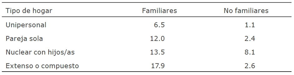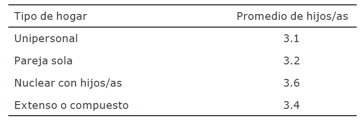 El promedio de hijas/os nacidos vivos se considera como un indicador de los miembros de la red familiar que en algún momento podrían ofrecer apoyo a sus padres o viceversa (Celade-Cepal, 2006). Al respecto se observa que las personas mayores de los distintos hogares tienen un número de hijos/as similar, siendo ligeramente mayor para quienes residen en hogares nucleares con hijos y en hogares extensos (Tabla 1).