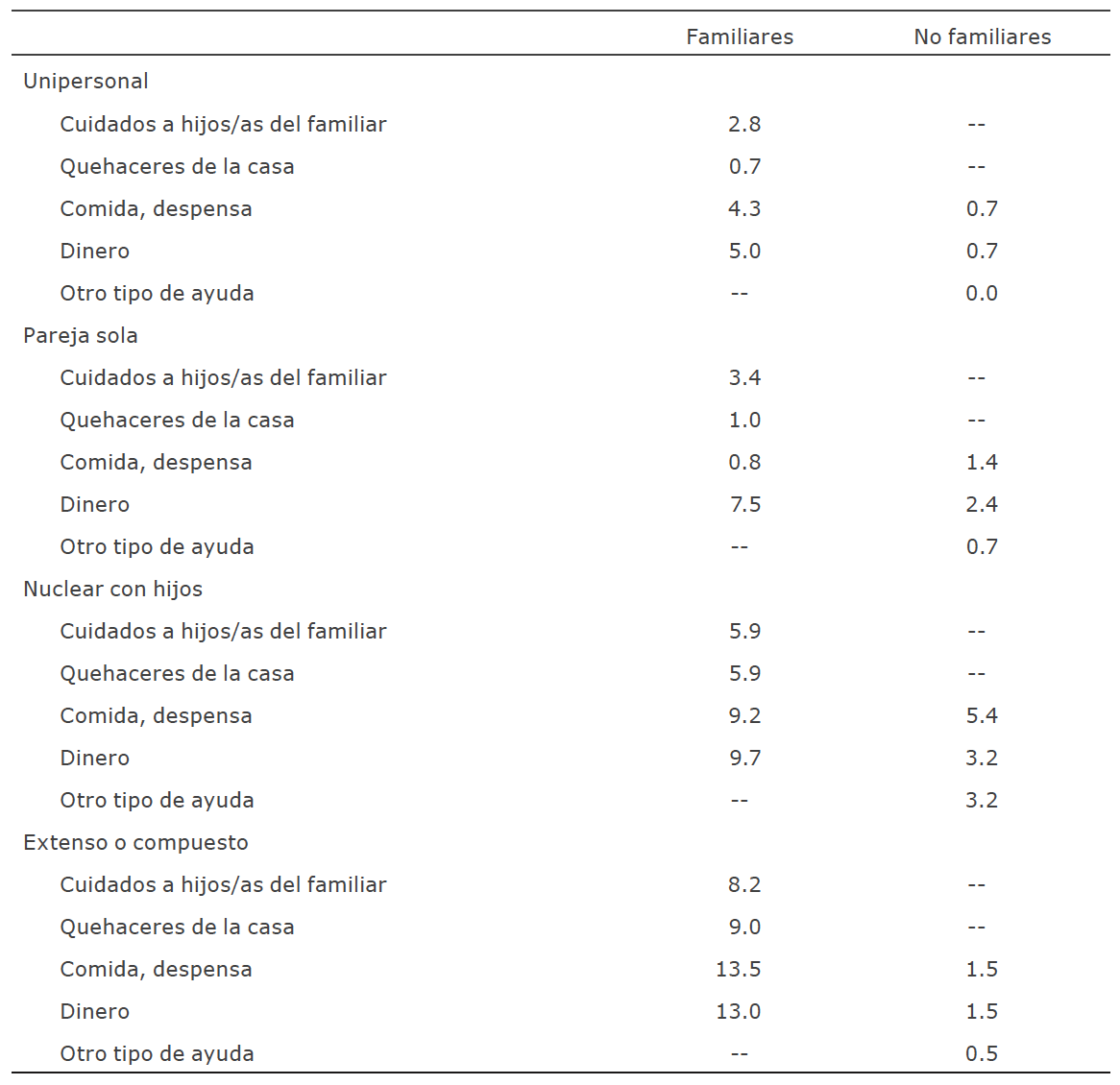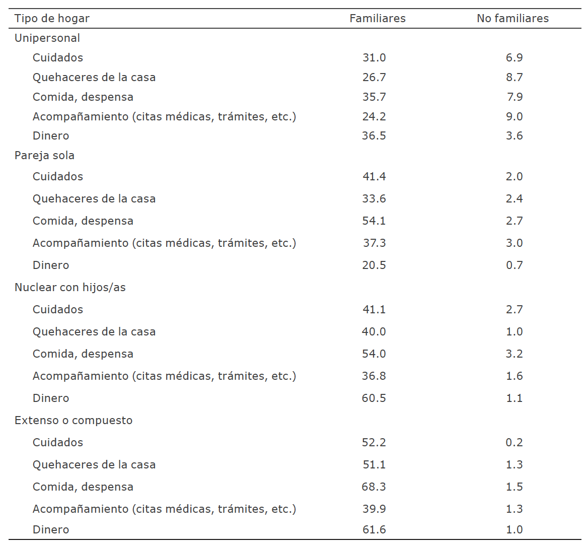 Los distintos tipos de apoyos (cuidados, quehaceres de la casa, comida, acompañamiento y dinero) provienen principalmente de familiares, pero claramente quienes son menos propensos a recibirlos son las personas que viven solas, seguidas de las que viven solo con su pareja. Destaca que el apoyo con dinero esté más presente en los primeros en comparación con los segundos. También, a diferencia del resto de los hogares, en los unipersonales existen mayores porcentajes de personas no familiares que otorgan apoyo a las personas mayores (Tabla 5).