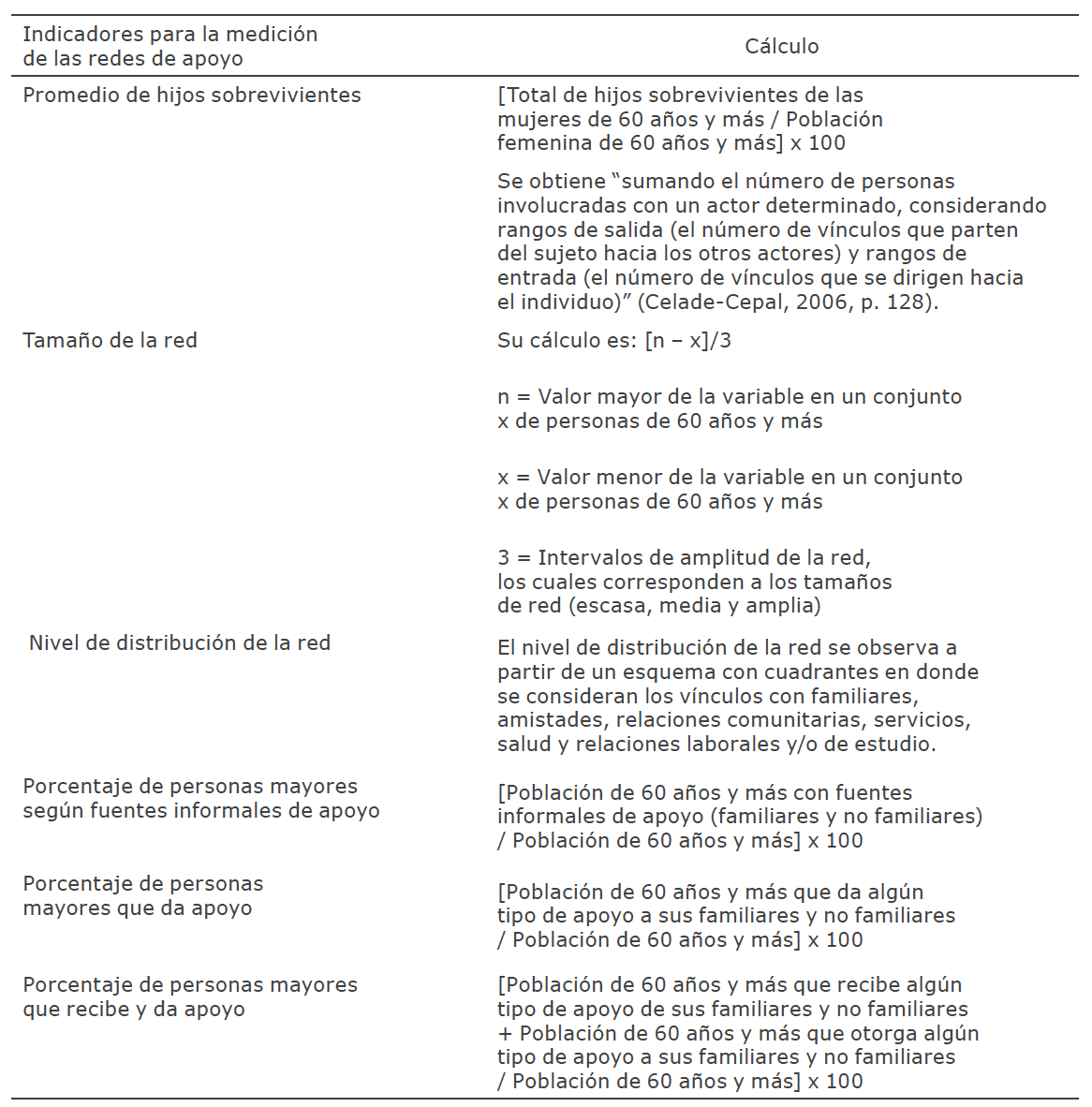 En 2006, el Centro Latinoamericano y Caribeño de Demografía (Celade) propuso un Manual sobre indicadores de calidad de vida en la vejez, en el cual enfatiza la importancia de la medición de los entornos físicos y sociales, y su relación con la calidad de vida de las personas mayores. Dentro de los entornos sociales, se consideran una serie de indicadores relacionados con las redes sociales de apoyo que serán considerados para este artículo.2
