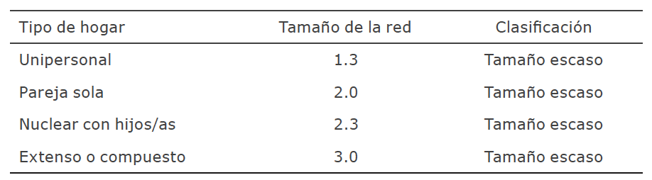 Al distinguir el tamaño de red por tipo de hogar, se puede observar que en todos los hogares se mantiene un tamaño de red escaso. Sin embargo, el número de personas vinculadas con la persona mayor que vive sola es menor al de los otros arreglos, y el más alto se presenta en los hogares extensos o compuestos (Tabla 2).