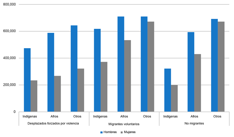 En el caso de los ingresos medios, los hombres indígenas perciben los salarios más bajos sin importar su condición migratoria, mientras que los afrodescendientes y aquellos que no se reconocen como parte de un grupo étnico tienen niveles similares. En el caso de las mujeres indígenas los ingresos son menores cuando no se ha migrado o lo han hecho por razones distintas a la violencia. Sin embargo, dentro de la población desplazada son las afrodescendientes quienes registran los ingresos más bajos. Un hallazgo importante es que, para estas mujeres, la migración afecta de manera importante el nivel de ingresos percibidos, siendo más agudo el impacto cuando la migración ha sido forzada.