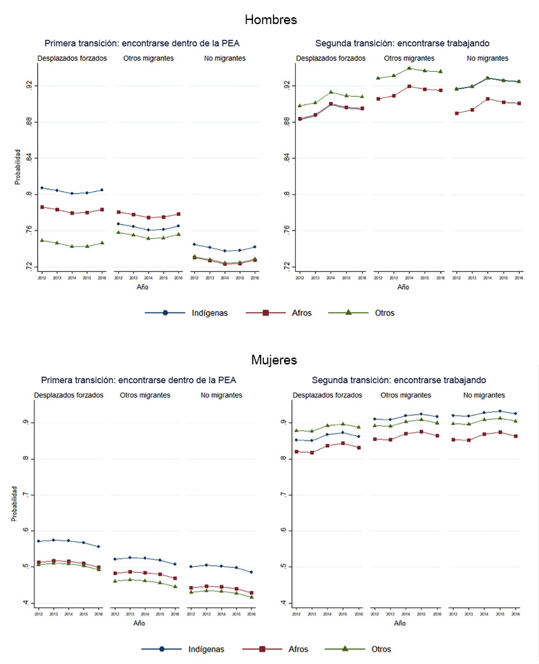 La Gráfica 2 muestra probabilidades de ocupación medias estimadas a partir de los modelos secuenciales para hombres y mujeres por separado. A lo largo del periodo de análisis, los hombres que no se reconocen como parte de un grupo étnico mantienen las probabilidades más bajas dentro de todas las condiciones migratorias, seguidos por la población afrodescendiente e indígena. No obstante, mientras los indígenas muestran probabilidades altas dentro de la población que no ha migrado y aquella que lo hizo por razones de violencia, aquellos que se reconocen como afrodescendientes alcanzan una mayor probabilidad cuando lo han hecho de manera voluntaria. Igualmente, es la población desplazada, en comparación con los otros grupos, quienes muestran mayores probabilidades de encontrarse dentro de la PEA, situación que refuerza la idea de que mayores condiciones de vulnerabilidad las llevan a presionar, en mayor medida, el ingreso al mercado laboral. Sin embargo, en el caso de los hombres que no se reconocen como parte de un grupo étnico las probabilidades son menores cuando migran de manera forzada, cuestión que no sucede con quienes integran los grupos étnicos.