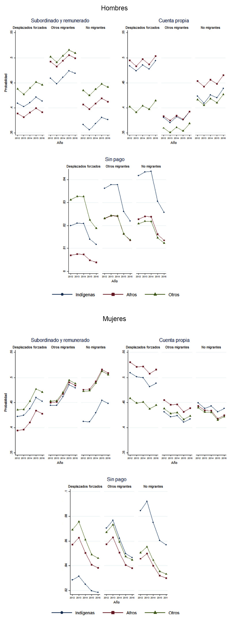 Las probabilidades de ser un trabajador por cuenta propia son más altas para las mujeres migrantes, y en el caso de las indígenas que no migraron. Asimismo, las probabilidades son mayores en el caso de los hombres, ya que a pesar de algunos valores bajos para el año 2016, las probabilidades son mayores a las del inicio del periodo. En el caso de las mujeres se ve una situación contraria, ya que luego del 2015 las probabilidades de ser trabajadora por cuenta propia son menores que en 2012. Dentro de la población desplazada por violencia, las probabilidades son mayores para las mujeres, a la vez que son las poblaciones afrodescendientes e indígenas las que tienen probabilidades más altas de emplearse en esta posición en comparación con aquellas personas que no se reconocen como parte de un grupo étnico. Entre los migrantes voluntarios hombres, los indígenas y afrodescendientes muestran probabilidades similares, a la vez que son superiores a las que exhiben aquellos que no se reconocen como parte de un grupo étnico. Para las mujeres en esta condición migratoria se observó que aquellas que se reconocen como indígenas muestran las probabilidades más bajas con relación al resto de la población y son las afrodescendientes quienes tienen mayores posibilidades de ocuparse en trabajos por cuenta propia que aquellas que no se reconocen como parte de un grupo étnico.