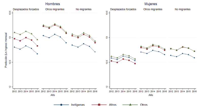 Estas tendencias son interesantes ya que al observarse la condición de desplazamiento forzado se evidencia una caída de los salarios para todas las poblaciones, pero se configura una brecha entre los grupos étnicos respecto a aquellos que no se reconocen como parte de estos, lo que muestra un deterioro más profundo en las condiciones laborales de estas poblaciones, particularmente para las mujeres que se reconocen como afrodescendientes y los hombres que se reconocen como indígenas.