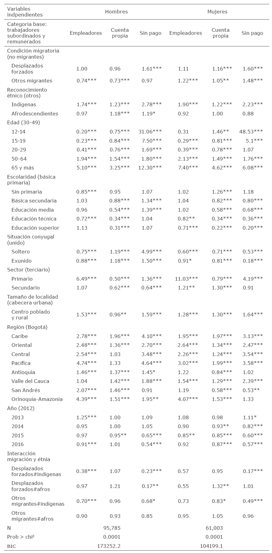 En cuanto a ser trabajadores sin pago, se observó que el riesgo de ocupar esta posición (en lugar de trabajador subordinado) es casi seis veces mayor para las mujeres que para los hombres. En el caso de hombres y mujeres, los que migraron por razones de violencia y por otras causas tienen un mayor riesgo de ser trabajador sin pago (vs. trabajador subordinado) respecto a aquellos que no migraron. Para los hombres, sin embargo, este último tipo de migración no presenta diferencias estadísticamente significativas. Reconocerse como indígena duplica, en ambos casos, el riesgo de ocupar esta posición respecto a quienes no se reconocen como parte de un grupo étnico y respecto a los trabajadores subordinados, mientras que las diferencias por reconocerse como afrodescendiente no son estadísticamente significativas.