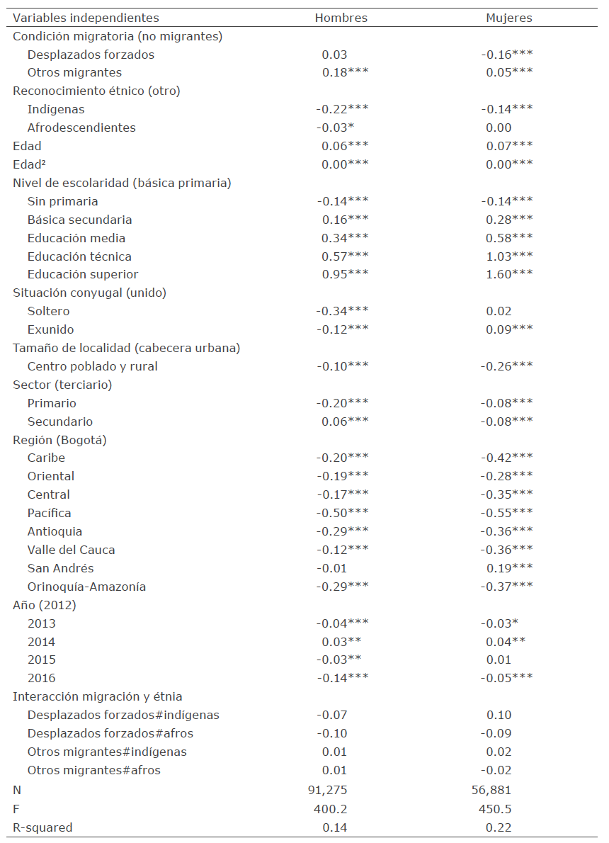 El reconocimiento étnico tiene un papel importante en la determinación del nivel de ingresos. Reconocerse como indígena provoca que hombres y mujeres registren ingresos respectivamente 20 y 13% menores que aquellas personas que no se reconocen como parte de un grupo étnico, mientras que los afrodescendientes no presentan diferencias estadísticamente significativas. Para hombres y mujeres, la educación muestra retornos positivos a partir de la básica secundaria: para las mujeres el ingreso se duplica cuando se llega al nivel de educación técnica y para los hombres a partir del nivel superior. Las variaciones del ingreso mensual para hombres y mujeres a través de los años muestran una disminución para 2016, situación que impacta a hombres y mujeres con la misma intensidad. Igualmente, las mujeres percibieron ingresos menores que los hombres durante todo el periodo, con una mayor desventaja para aquellas que son desplazadas forzadas.