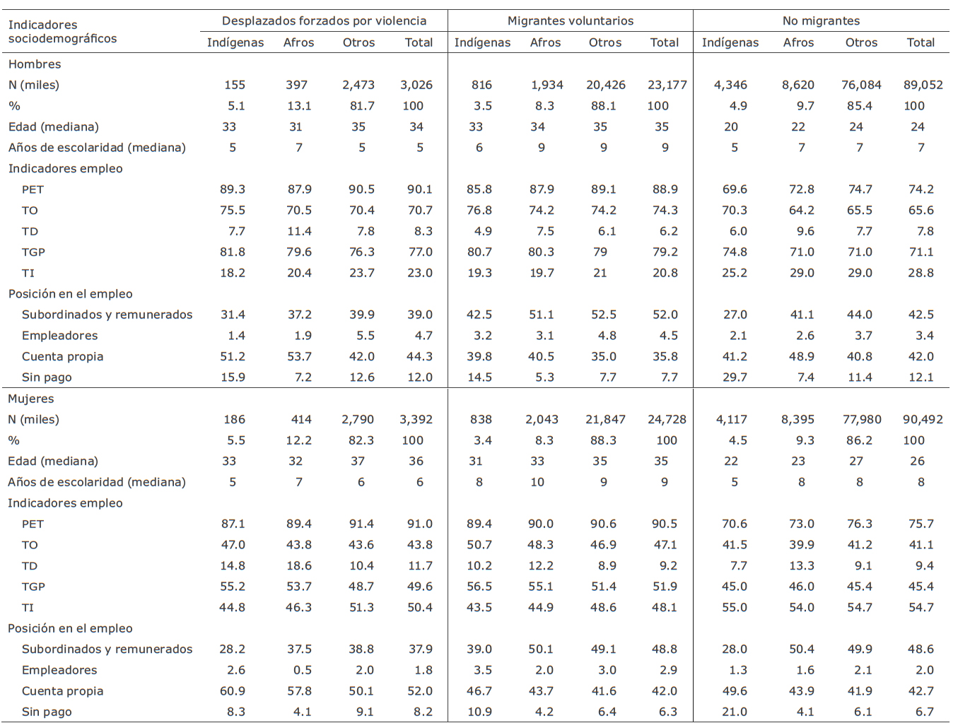 El Cuadro 1 presenta características sociodemográficas básicas según condición migratoria y pertenencia étnica para hombres y mujeres. Se observa una mayor presencia relativa de indígenas y afrodescendientes en el grupo de la población que ha migrado forzadamente: alrededor del 18% de la población se reconoce como parte de estos grupos étnicos, mientras que entre los no migrantes este no alcanza el 15%, y entre los migrantes voluntarios no alcanza el 12%. El grupo con la población más joven es aquel que no ha migrado, ya que los hombres tienen una edad media de 24 años, y las mujeres de 26. En el resto de los grupos la edad oscila entre los 34 y 36 años respectivamente. Como se espera, por mecanismos de selectividad educativa asociados al migrar para trabajar o estudiar, son los migrantes voluntarios aquellos con un mayor nivel de escolaridad, aunque esto varía según el grupo étnico: los hombres y mujeres indígenas son los que tienen menores años de escolaridad.