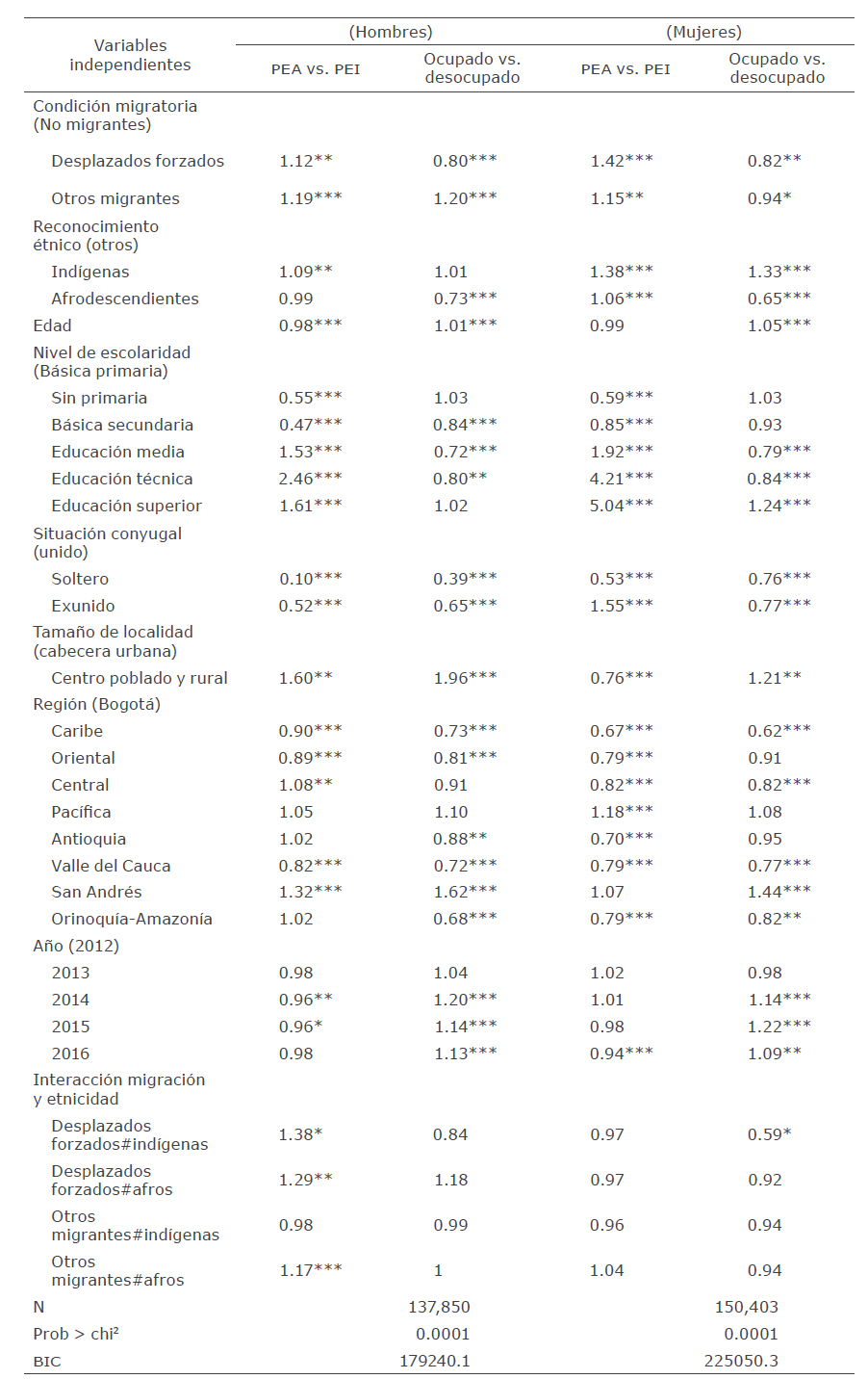 Fuente: Elaboración propia a partir de la ENCV 2012-2016Para la primera transición, se encontró que residir en territorios rurales, y haber migrado por razones distintas a la violencia son elementos que privilegian su presencia dentro de la PEA. En cuanto a la pertenencia étnica, reconocerse como indígena aumenta la probabilidad de encontrase dentro de la PEA, a la vez que tener el nivel de educación media muestra la propensión más alta de estar en este grupo (or = 2.46). En comparación con Bogotá, las probabilidades de encontrarse en la PEA son menores en otras regiones, exceptuando la región Central y San Andrés, ya que estas muestran una mayor propensión debido a un mejoramiento del aparato productivo, que en los últimos diez años ha permitido que se eleve la tasa de ocupación respecto a las principales zonas metropolitanas (DANE, 2017a).