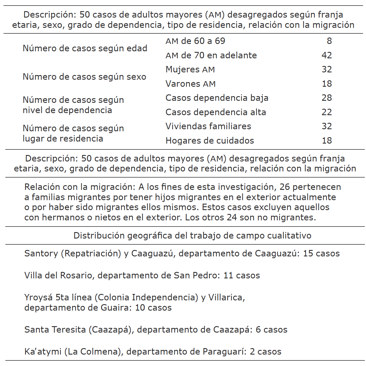 Para identificar las estrategias que despliegan las familias frente a recursos escasos, se realizó un trabajo de campo binacional basado en 50 casos de adultos mayores en cinco departamentos de Paraguay, en localidades con diferentes grados de ruralidad. Los casos fueron seleccionados mediante el método de bola de nieve, siguiendo criterios analíticos. Se buscó contar con diversidad de situaciones en cuanto a nivel de dependencia y sexo: 28 casos de dependencia baja y 22 de dependencia alta, de los cuales 32 eran mujeres y 18 varones.