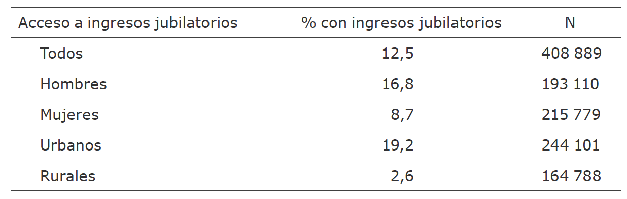 La EPH 2016 revela que 2 de cada 10 adultos mayores se encuentran en situación de pobreza. A su vez, al analizar el acceso a jubilaciones y seguro de salud por sexo y área de residencia, la situación de las personas mayores que residen en zonas rurales y de las adultas mayores mujeres es para todos los casos aún más desalentadora. Solo 8,7 % de las mujeres adultas mayores y 2,6 % de todos los adultos mayores con residencia rural acceden a ingresos jubilatorios. Por otro lado, no existe gran diferencia de acceso a servicios sanitarios entre adultos mayores hombres y mujeres, aunque sí es marcado y notorio el hecho de que 80,7 % de todos los adultos mayores en zonas rurales no dispongan de ningún servicio médico por fuera del sistema público.