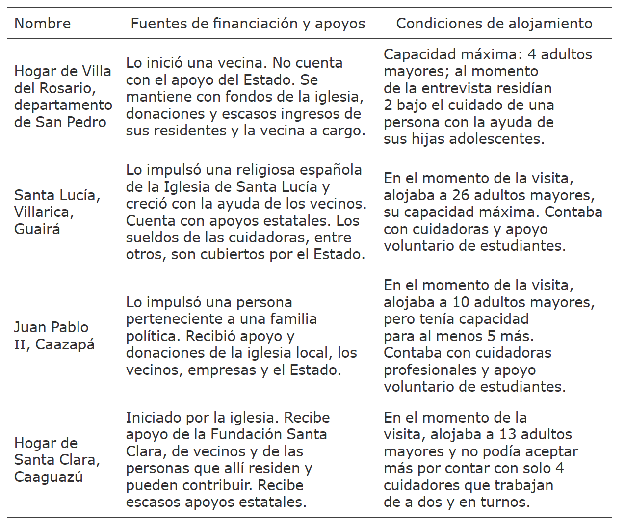 En el entorno rural de Paraguay el cuidado se desarrolla primordial y casi exclusivamente por las familias, y dentro de ellas, por las mujeres. No existen opciones reales para adultos mayores con bajos ingresos de habitar espacios diferentes al familiar cuando empiezan a requerir mayores apoyos. Los espacios de cuidado no familistas son escasos en todo el país. Se estima que existen ochenta instituciones (algunas muy pequeñas) y la información censal disponible indica que la mayoría se encuentra en Asunción.