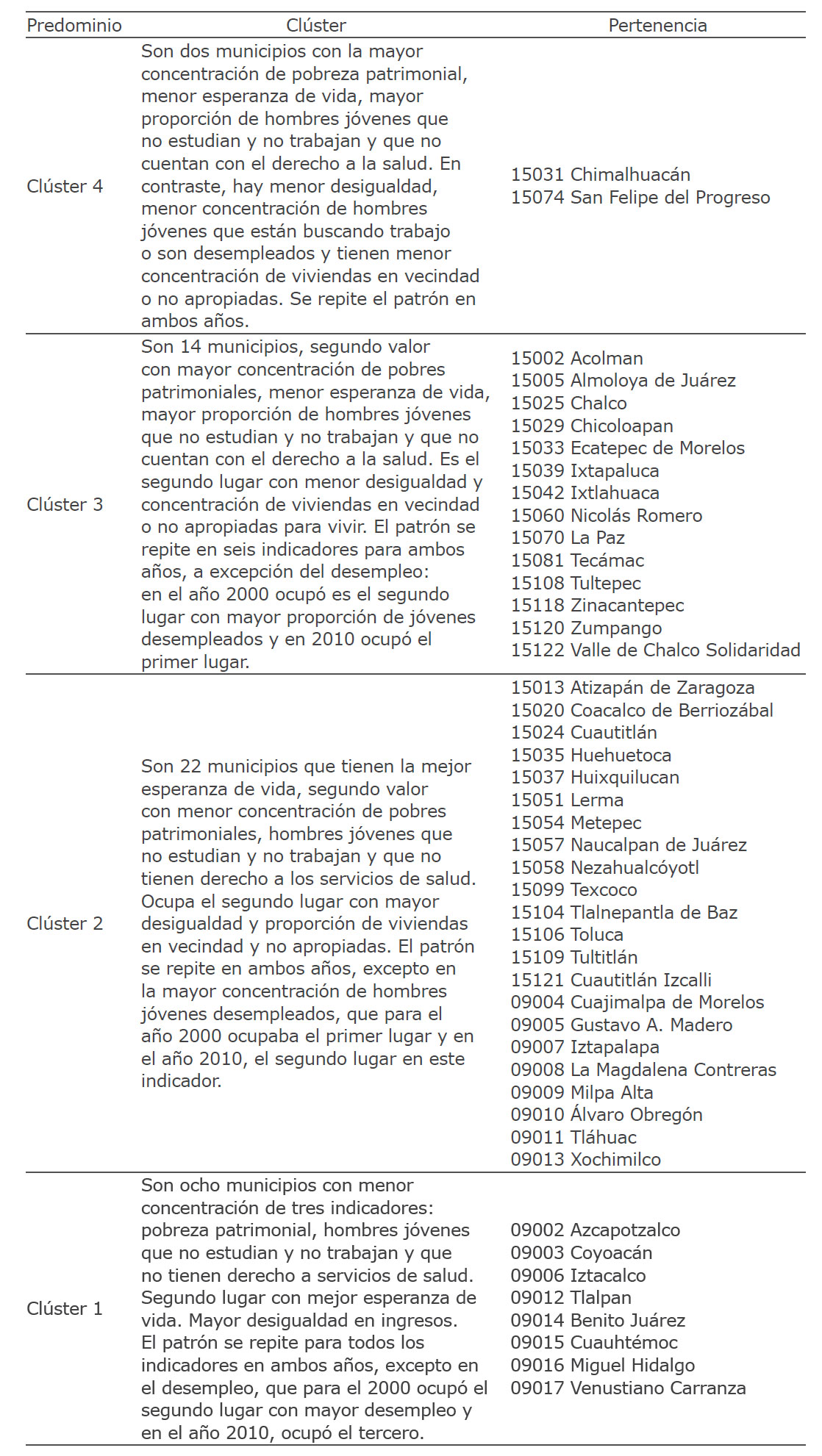 A través de un análisis de clústeres, definidos de acuerdo a las características de la población, se pudieron corroborar las relaciones entre la intensidad del homicidio y las características socioeconómicas de la población, ya que a las unidades con peores indicadores correspondieron las más elevadas tasas de homicidio masculino, y viceversa. Aunque el crecimiento más intenso del homicidio juvenil masculino se dio en el clúster 1, con mejores condiciones socioeconómicas, en cuanto al bajo nivel de pobreza patrimonial de jóvenes sin acceso a salud y que no estudian o trabajan (aunque con mayor desigualdad económica), este incremento estuvo concentrado entre los jóvenes de baja escolaridad (2000-2002 y 2010-2012).