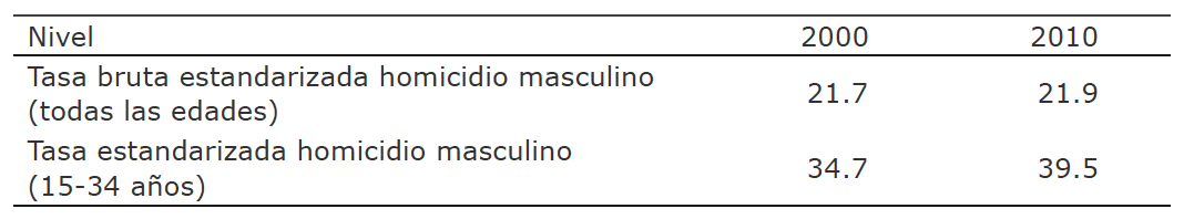 Durante la década del 2000, Latinoamérica destacó por sus elevadas tasas de muertes violentas, particularmente entre la población juvenil masculina (15 a 29 años; Lussier, Bourbeau y Choinière, 2008). En México, el aumento de este tipo de mortalidad (2005-2015) estuvo fuertemente influenciado por el alza del homicidio (INEGI, 2017a), principalmente a partir del año 2008 (Díaz, 2016), cuando se registró un aumento en la incidencia entre hombres jóvenes residentes de las periferias urbanas (Banco Mundial, 2012).
