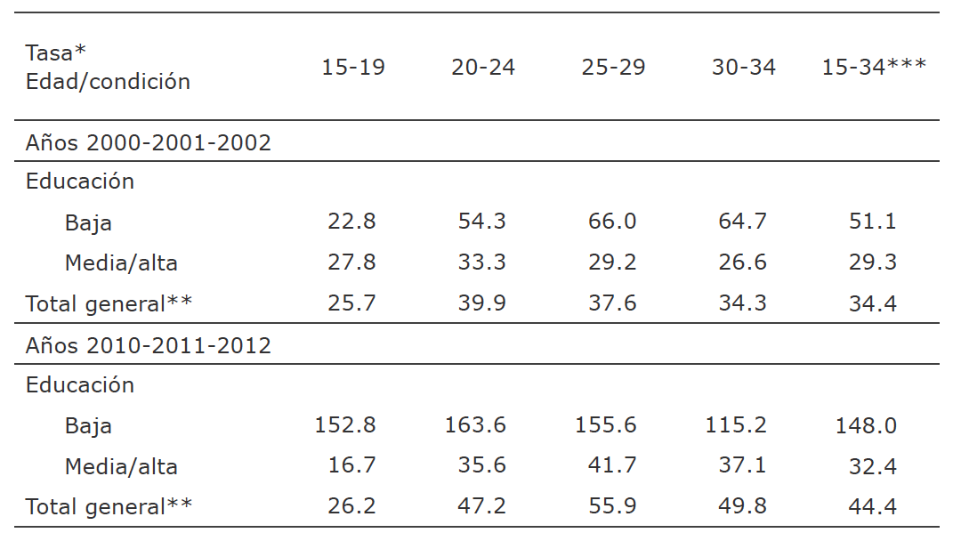 Se tomó como referencia la residencia habitual del fallecido, con el fin de que exista comparabilidad con las condiciones socioeconómicas de su municipio/delegación de origen. Con relación a la clasificación de la escolaridad5 de la víctima, cuando se habla de baja escolaridad, se entiende: 1) sin escolaridad; 2) menos de tres años de primaria/preescolar; 3) de 3 a 5 años de primaria/primaria incompleta, y (4) primaria completa (2000-2002 y 2010-2012). Cuando se habla de escolaridad media/alta, para el año 2000, se entiende: 5) secundaria o equivalente; 6) preparatoria o equivalente, y 7) profesional. Para el año 2010, se considera: 5) secundaria incompleta; 6) secundaria completa; 7) bachillerato o preparatoria incompleto; 8) bachillerato o preparatoria completo; 9) profesional, y 10) posgrado. Los casos de homicidio masculino (15-34 años), en las categorías de educación, son demasiados reducidos en ambos extremos para poder aumentar el número de agrupaciones, por lo que se eligió apenas dos: escolaridad baja y media/alta.