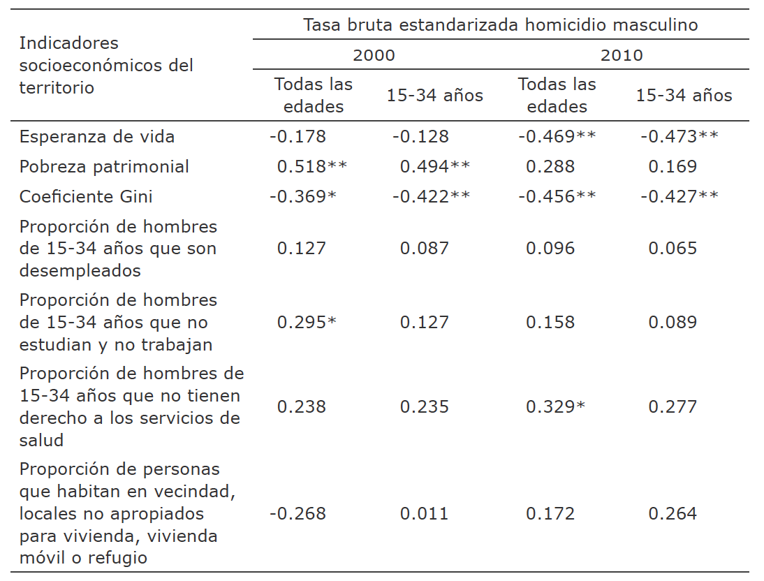 Limberopulos Fernández (2016) buscó una correlación directa entre los mejores niveles de desarrollo social y las menores tasas de homicidios de la población juvenil (15-29 años) de los municipios metropolitanos de México (2010). Como resultado, se encuentra que mayores niveles de escolaridad, mejor acceso a la salud, así como una mayor proporción de empleo formal son condiciones que tienden a disminuir el riesgo de victimización por homicidio. Orozco Alvarado (2012), en el intento de asociar el homicidio con indicadores sociodemográficos y económicos de los municipios mexicanos más poblados (2000 y 2010), confirma la asociación entre desigualdad económica y homicidio, pero no encuentra relación con las variables de educación y empleo.
