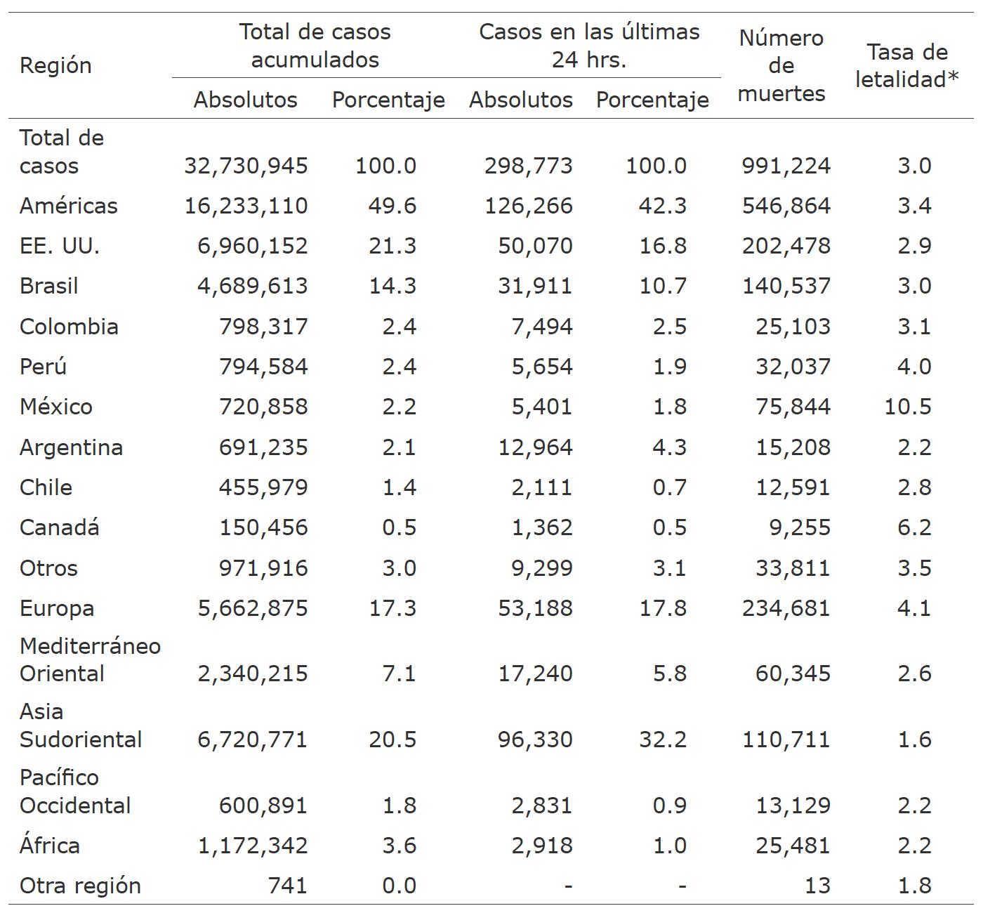 Tabla 1. Casos acumulados de COVID-19 por SARS-CoV-2, según región de la Organización Mundial de la Salud, 2020