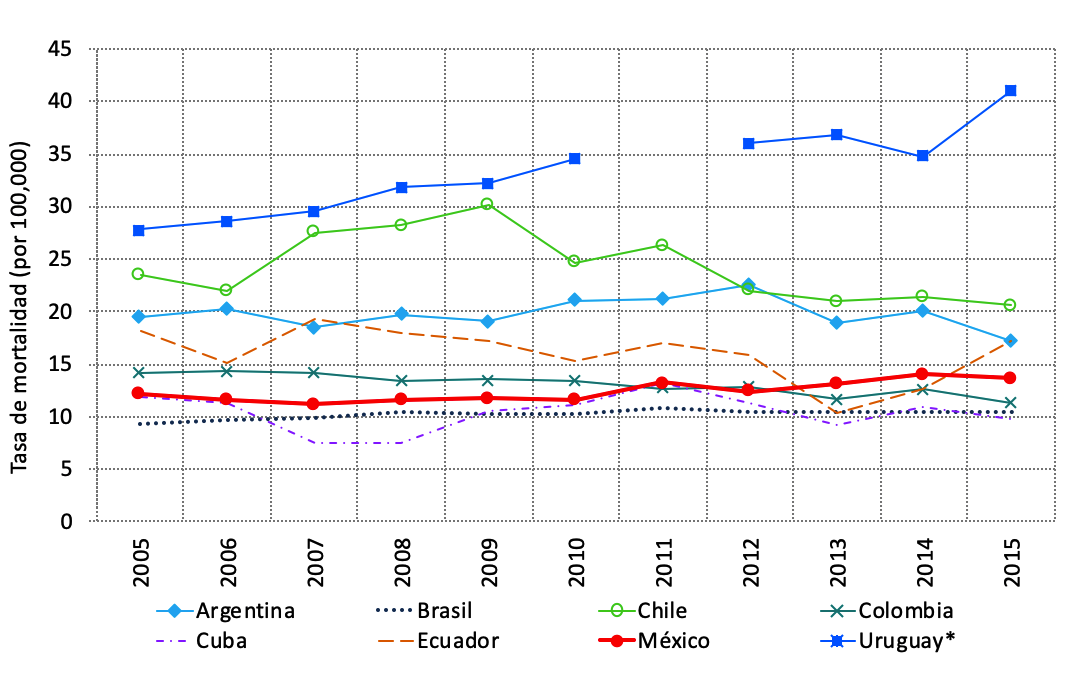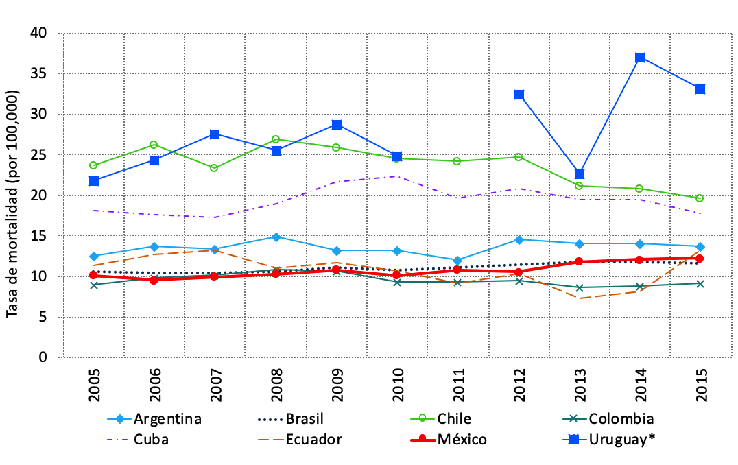 Fuente: elaboración propia a partir de WHO Mortality Database y estimaciones de población de Naciones Unidas.Chile nuevamente manifiesta el segundo nivel más alto de mortalidad por esta causa para este grupo de adultos, sin embargo, entre 2005 y 2015 exterioriza una disminución ostensible de la intensidad de la mortalidad por suicidio. El examen de la información para este grupo etario indica que Uruguay es el país con la mayor mortalidad por suicidio en la primera etapa de la adultez (30 a 44 años). Al igual que en el caso de la población de 20 a 29 años, en 2015 Ecuador registra un incremento en el nivel de la mortalidad por esta causa, lo que sugiere la necesidad de dar seguimiento cercano al patrón que describirá en años subsecuentes.