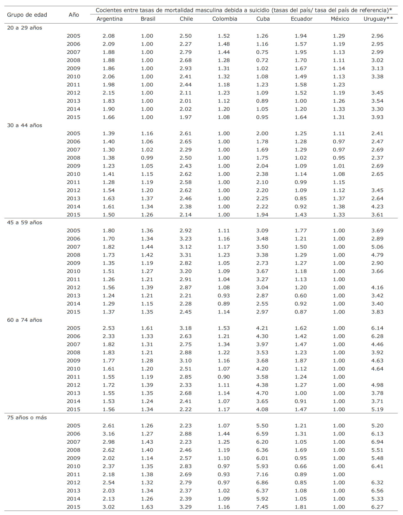 Los cocientes de las tasas de mortalidad indican que, en 2005, la mortalidad por suicidio en Argentina, Brasil, Ecuador y México excedían entre 10% y casi 40% la observada en Colombia para la población masculina de 30 a 44 años, que Cuba duplicaba la intensidad de la mortalidad por esta causa de defunción respecto a Colombia y, finalmente, que Uruguay y Chile mostraban niveles de suicidio entre 1.4 y 1.6 veces el identificado para Colombia. Para 2015, Uruguay presenta el cambio más preocupante con un incremento de la mortalidad por suicidio en hombres de 30 a 44 años que representa 3.6 veces la intensidad registrada para Colombia en el mismo año (Tabla 1).