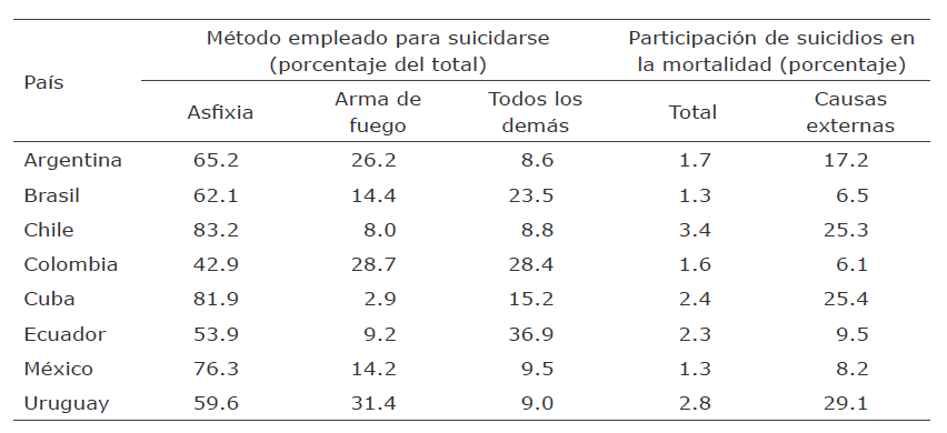Los hombres utilizan con mayor frecuencia armas e instrumentos para provocar asfixia (Bustamante et al., 2016; Cendales et al., 2007) como métodos para suicidarse. La Tabla 2 muestra la importancia relativa de la utilización de armas de fuego o de mecanismos que provocan asfixia como métodos para suicidarse en los ochos países analizados. Esta información refuerza la importancia de restringir la disponibilidad de armas de fuego en la sociedad (Bachmann, 2018; Mann y Michel, 2016) toda vez que en Argentina, Colombia y Uruguay más de una cuarta parte del total de suicidios masculinos ocurrieron como resultado del uso de estas. Los datos contenidos en la Tabla 2 también permiten reconocer el espacio del suicidio como causa de muerte tanto en su total como en el conjunto de causas externas. En Chile, Cuba y Uruguay más del 25% del total de defunciones debidas a lesiones o accidentes, es decir a causas externas, corresponde a suicidio.