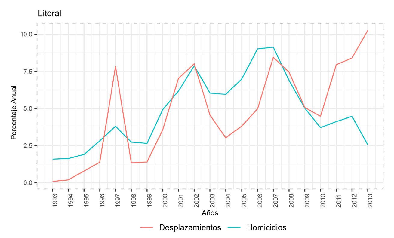 La intensidad del conflicto armado en el litoral Pacífico colombiano, medida en términos de homicidios o desplazamiento, ha presentado cambios desde 1993 hasta 2013. Estos dos indicadores se incrementaron significativamente entre 1996 y 2008, principalmente por las muertes violentas, mientras que los desplazamientos se prolongaron hasta el año 2013. Según los reportes estadísticos del Registro único de víctimas (Unidad de Víctimas, 2020) acerca de los homicidios y los desplazamientos forzados, se advierte que la intensidad de la violencia presentó fluctuaciones entre el periodo 1993-2013 para el litoral Pacífico. De acuerdo con la distribución anual de los homicidios en relación con el total de las defunciones del periodo, el promedio de los primeros 5 años (1993-1997) fue 2.35%; de los segundos (1998-2001), 4.87%; de los terceros (2002-2006), 7.42% y de los últimos años (2007-2013), 4.46 %. Este comportamiento se encuentra relacionado con la dinámica del conflicto. La intensidad del conflicto, entendida desde el número de muertes, indica un auge en algunos años (1998-2006) y una caída en otros (2007-2013).