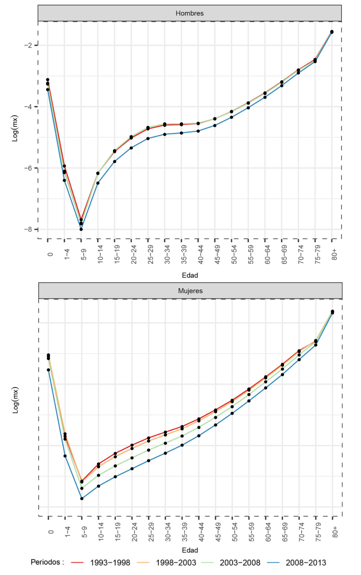 Además, el patrón de mortalidad por edad muestra una clara diferencia entre hombres y mujeres. Mientras que en las mujeres las tasas de mortalidad se incrementan casi de manera lineal en edades 5+ (en escala logarítmica) y van disminuyendo a través del tiempo (valores más negativos en escala logarítmica). Para los hombres se muestra un incremento sustancial particularmente en edades entre 10-14 y 35-39 años que se mantienen a niveles elevados entre 1993 y 2008. Por ejemplo, las tasas de mortalidad por edad para los períodos 1993-1998, 1998-2003 y 2003-2008 son prácticamente imposibles de diferenciar entre los hombres ya que se encuentran una encima de la otra. Esto indica que los altos niveles de mortalidad entre los hombres se mantuvieron prácticamente iguales en un lapso de 15 años. Es hasta el último periodo quinquenal (2008-2013) que se observa una disminución en las tasas de mortalidad por edad.