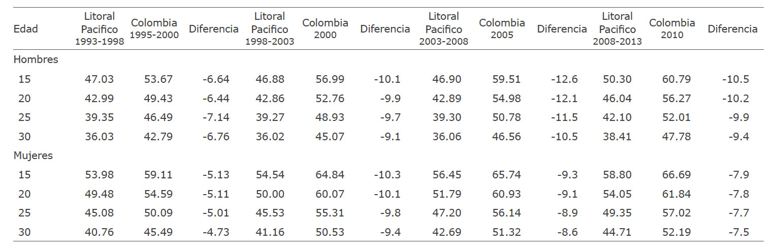 En la Tabla 1 se muestran esperanzas de vida para Colombia en varios años por edad y sexo calculadas por el DANE o la Organización Mundial de la Salud y su comparación con las estimaciones que hemos obtenido en el litoral Pacífico colombiano. Los datos mostrados en la Tabla 1 no son del todo comparables debido a que los periodos no son los mismos, sin embargo, permiten dimensionar la diferencia en estos valores entre esta región y el nivel nacional. Los resultados muestran que la esperanza de vida es mucho menor en el litoral Pacífico colombiano en todos los periodos y edades, con una diferencia de alrededor de 10 años en cada una de las edades. Esta diferencia es ligeramente menor entre las mujeres, principalmente en el último periodo de estudio (2008-2013).