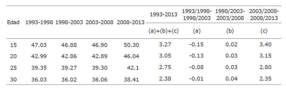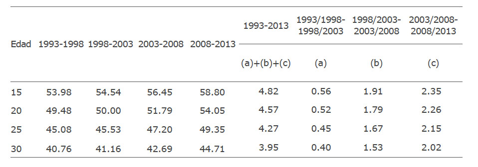 Según los resultados presentados en la Tabla 2, la esperanza de vida en esta región de los individuos de 15 años aumentó 3.27 años desde 1993-1998 hasta 2008-2013. No obstante, ese aumento estuvo marcado por un incremento en la mortalidad a finales de los años 1990, una lenta mejoría a principios del año 2000 y un gran avance en el último periodo de 2008- 2013. Por ejemplo, entre los periodos quinquenales 1993-1998 y 1998-2003 se observó una reducción de 0.15 años (valor negativo) en la esperanza de vida a edad 15, como resultado del incremento en las tasas de mortalidad durante ese periodo en edades de 15 años y más. Entre los periodos 1998-2003 y 2003-2008 se presentó una leve mejoría en las condiciones de mortalidad que llevaron a un aumento de apenas 0.02 años en la esperanza de vida. Sin embargo, es entre los quinquenios 2003-2008 y 2008-2013 que la esperanza de vida en la edad de 15 años aumentó de manera importante logrando un incremento de 3.4 años de vida durante ese periodo. De esta manera el incremento en la esperanza de vida a edad 15 años en la totalidad del periodo tuvo como resultado un aumento de 3.27 años de vida; pero es hasta el último periodo quinquenal en el que se logra el mayor aumento. El patrón es similar para la esperanza de vida en las edades 20, 25 y 30 años, aunque las respectivas magnitudes de cambio en la esperanza de vida son menores.