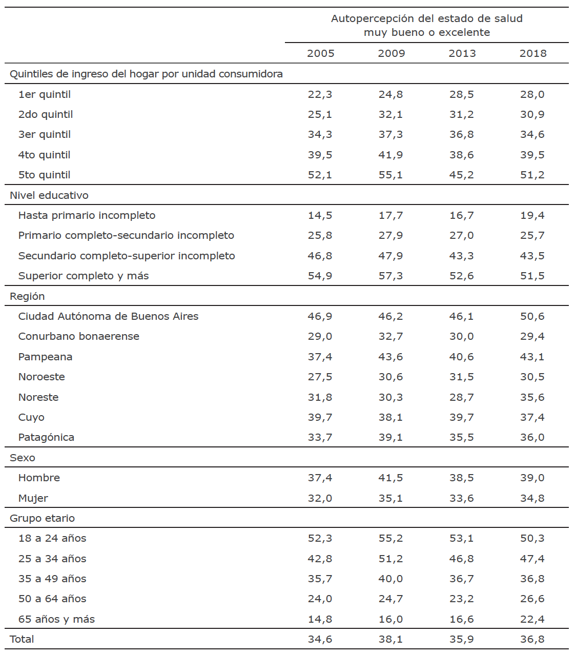 En la Tabla 1 se observa que en todas las ENFR existen diferencias en la autopercepción del estado de salud según quintiles de ingreso por unidad consumidora del hogar, nivel educativo, región de residencia, género y grupo etario. En todas las encuestas es mayor el porcentaje de personas que tienen una autopercepción de su salud muy buena o excelente entre quienes tienen estudios superiores, pertenecen a hogares de mayores ingresos, residen en la Ciudad Autónoma de Buenos Aires (CABA), pertenecen a los grupos etarios más jóvenes (18 a 24 años y 25 a 34 años) y son hombres. En cambio, entre quienes residen en los hogares de menores ingresos, tienen menores niveles educativos, quienes residen en el conurbano bonaerense, el Noreste y el Noroeste, las mujeres y los adultos mayores (65 años y más)5 se observan menores niveles de población con una autopercepción muy buena o excelente.