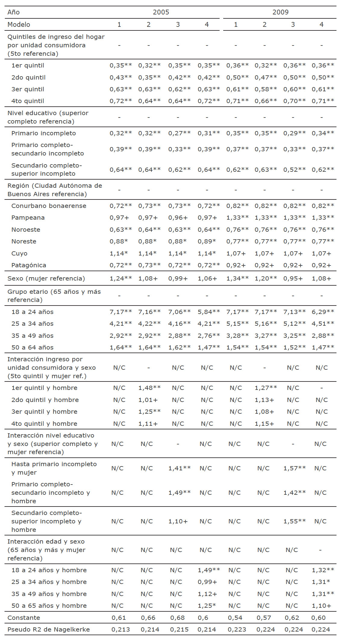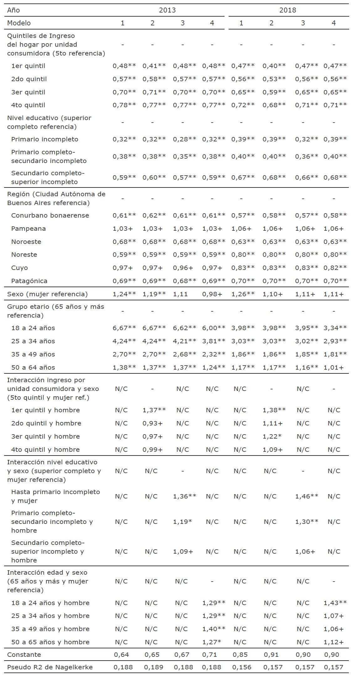 A continuación, para cada una de las cuatro ediciones de la ENFR, realizamos un modelo de regresión logística binaria en el que incorporamos las cinco variables independientes (Modelo 1 en la Tabla 2). Este modelo permite examinar el efecto neto de cada variable independiente sobre la dependiente, una vez controlado el efecto de las otras. A este tipo de modelo se lo denomina de efectos principales, y no calcula si las desigualdades generadas por cada variable independiente varían en las distintas categorías de las restantes variables; es decir, considera a las desigualdades únicamente de forma aditiva (Bauer, 2014; Bauer et al., 2014; Bowleg y Bauer, 2016; Jaccard, 2001). Las desventajas de ser mujer, de bajos ingresos y de bajo nivel educativo, las modela por separado una vez controlado el efecto neto de las otras. De esta forma, no permite analizar si existen efectos multiplicativos o entrelazados entre las variables. Por ejemplo, si las diferencias de género se mantienen constantes según el nivel educativo, el ingreso per cápita del hogar y el grupo etario, o por el contrario varían y se tornan más intensas para algunos grupos y más débiles (o inexistentes) para otros.