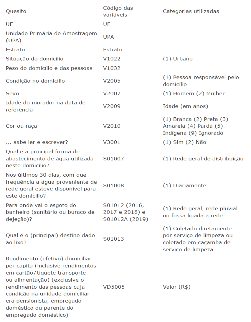 A metodologia de análise foi feita a partir da construção de estatísticas descritiva e de regressão logística múltipla (RLM). As estimativas de pessoas e domicílios foram apresentadas para a área urbana do Brasil e suas Regiões (Norte, Nordeste, Sudeste, Sul e Centro-Oeste), segundo cor / raça (branca, preta, amarela, parda, indígena) e os desfechos relacionados a infraestrutura de saneamento básico (abastecimento de água por rede geral de distribuição, abastecimento diário de água no domicílio, esgotamento sanitário por rede geral ou fossa séptica e coleta de lixo por serviço de limpeza). Para a categorização étnico / racial dos domicílios, foi utilizada como proxy a cor / raça do responsável (V2005, Condição no domicílio). A tabela 1 apresenta as variáveis e categorias, segundo ano da PNADc, utilizadas neste estudo.