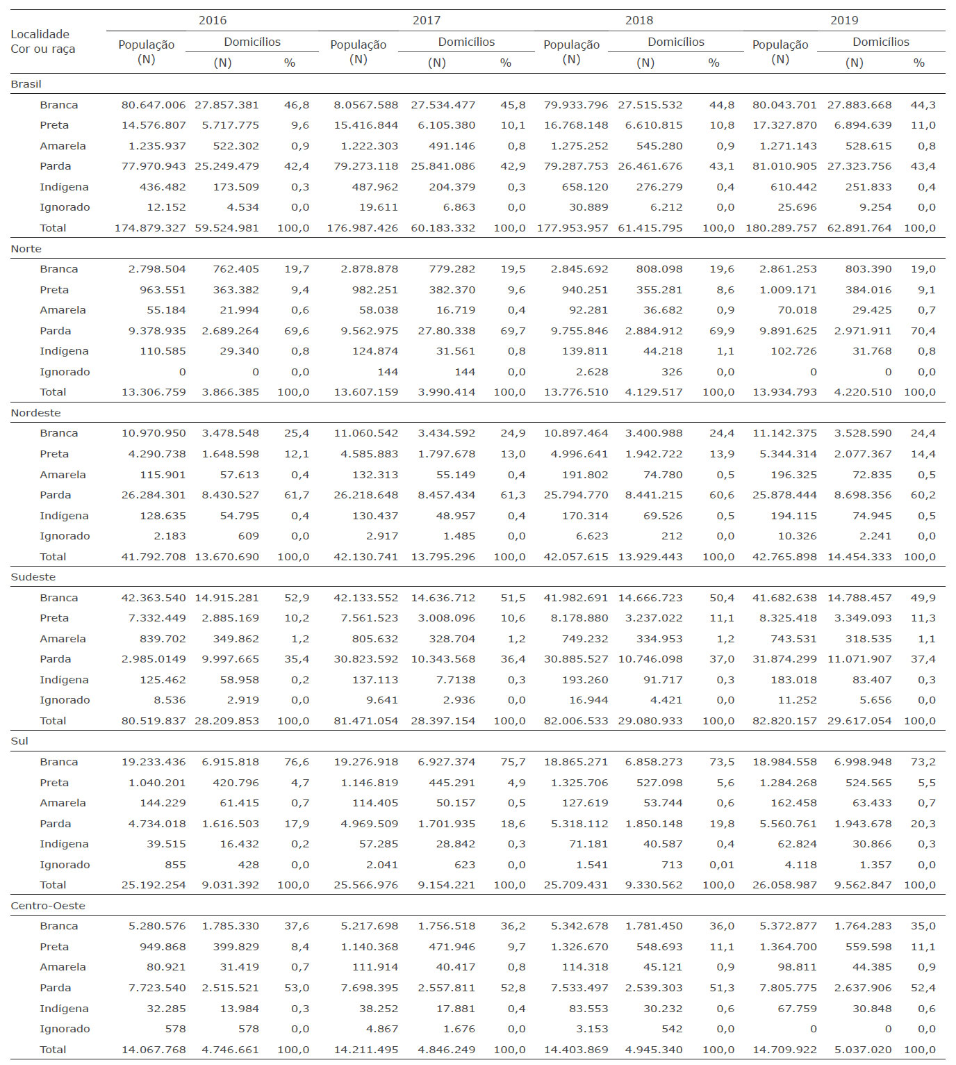 Para o Brasil, em todos os anos analisados (2016 a 2019), pessoas categorizadas como brancos e pardos se aproximaram em números absolutos e relativos, representando a maior parte da população. Contudo, no Norte, Nordeste e Centro-Oeste houve predominância de pardos enquanto no Sudeste e Sul, de brancos (Tabela 2).
