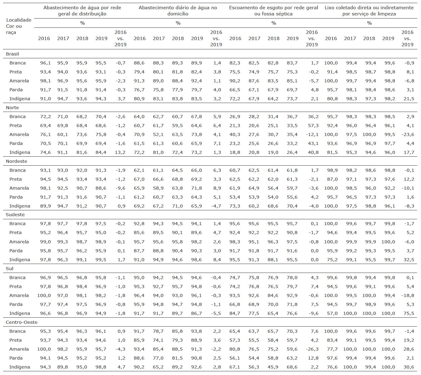 Sobre as características relacionadas ao saneamento básico no Brasil, o abastecimento de água por rede geral de distribuição e lixo coletado por serviço de limpeza são os serviços que apresentam as maiores ocorrências, acima de 90,0 %, para todos os anos e domicílios, independentemente da cor / raça do responsável. A única exceção foi que, em 2016, quando o lixo coletado por serviço de limpeza para indígenas esteve presente em 80,8 % dos domicílios. Os menores percentuais encontrados foram registrados para o serviço de escoamento de esgoto por rede geral ou fossa séptica no Brasil, em particular para domicílios com responsáveis da cor / raça pardos e indígenas. Em relação ao abastecimento diário de água nos domicílios, só ultrapassam 90,0 % os domicílios cuja cor / raça do responsável é amarela, nos anos de 2016 e 2019. Domicílios cujos responsáveis eram pardos, pretos e indígenas apresentam as menores porcentagens em todos os anos analisados. Considerando apenas os anos de 2016 e 2019, os indígenas tiveram os maiores aumentos percentuais no número de domicílios com presença dos serviços de abastecimento de água por rede geral de distribuição (3,7 %) e lixo coletado por serviço de limpeza (21,5 %) (Tabela 3).
