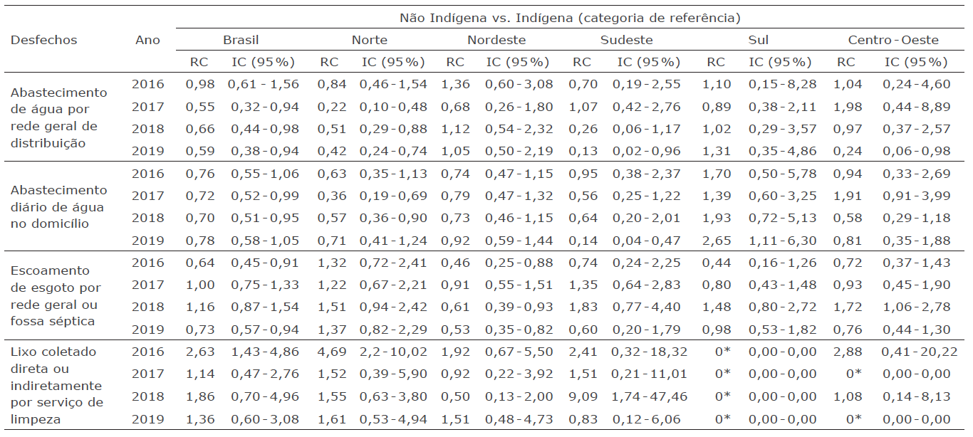 Os casos em que os modelos de RLM indicaram desvantagem significativas estatisticamente dos domicílios indígenas em relação aos não indígenas foram: em 2016, no Norte em relação a presença de lixo coletado por serviço de limpeza (RC = 4,69; IC(95 %) = 2,20-10,02); no Sul, em 2019, para a ocorrência de abastecimento diário de água no domicílio (RC = 2,65; IC(95 %) = 1,11-6,30); e no Centro-Oeste, em 2018, para escoamento de esgoto por rede geral ou fossa séptica (RC = 1,72; IC(95 %) = 1,06-2,78) (Tabela 4).
