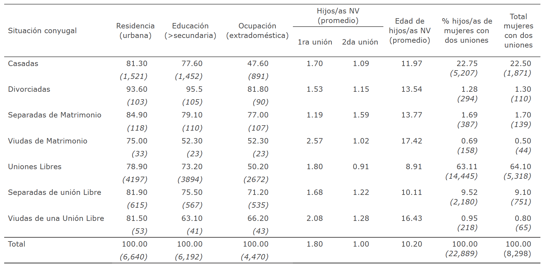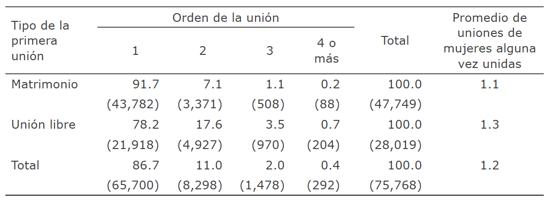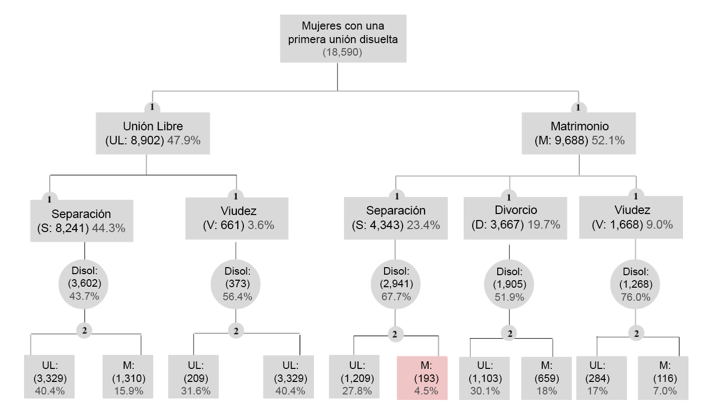 Las cifras anteriores revelan que solamente las mujeres separadas de primeras uniones libres se reemparejan en una proporción superior a 50 % (56.3 %) ya sea en una nueva unión libre o matrimonio. El segundo lugar lo ocupan quienes se divorcian y contraen una segunda unión (48.1 %), la mayoría de las veces una unión libre (63 %). Las que menos transitan a una segunda unión son las casadas que se separan o enviudan (entre 24 % y 28 %). En términos generales, menos de la mitad de las mujeres en uniones disueltas contrae una segunda unión (44 %), la cual es, la mayoría de las veces, una unión libre.