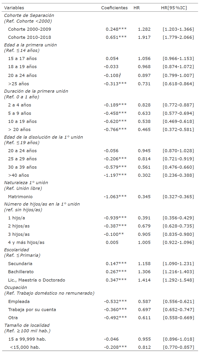 Por último, se acude a la estimación de un modelo de riesgos proporcionales tipo Cox como instrumento estadístico que permite conocer los riesgos de las mujeres mexicanas de transitar a una segunda unión y las principales variables que influyen en este proceso. Las variables explicativas utilizadas son las siguientes: cohortes según año de disolución de la primera unión, edad de la primera unión, la duración y la edad de la disolución de la primera unión, la naturaleza de la primera unión, el número de hijos / as tenidos durante la primera unión, la escolaridad, el tipo de ocupación y el tamaño de localidad de residencia.