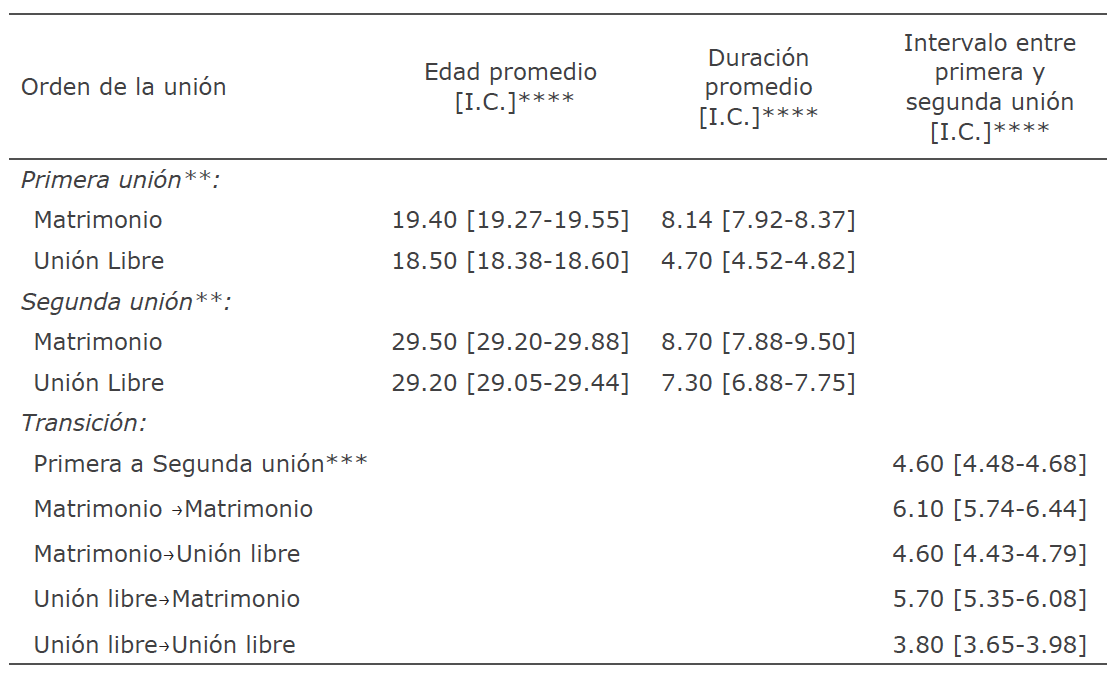 La Tabla 2 contiene algunos indicadores de calendario por orden y tipo de segunda unión. Con ellos se constata cómo el primer matrimonio se celebra casi un año más tarde (19.4 años) que las mujeres que se unen en unión libre (18.5 años). Tratándose de la edad promedio a la segunda unión las edades, tanto de casadas como convivientes, bordean los 30 años y sus diferencias son inferiores a uno (0.7 años). En cuanto a sus duraciones, los primeros matrimonios de quienes están en una segunda unión duraron 3.3 años más en promedio (8.0 y 4.7 años respectivamente) que las uniones libres; es decir, 40 % más de tiempo. Esta diferencia se reduce 1.4 años cuando se trata de la duración de las segundas uniones (8.7 y 7.3 años). La duración de las uniones libres se prolonga, por su parte, 2.6 años en promedio (de 4.7 a 7.3 años).