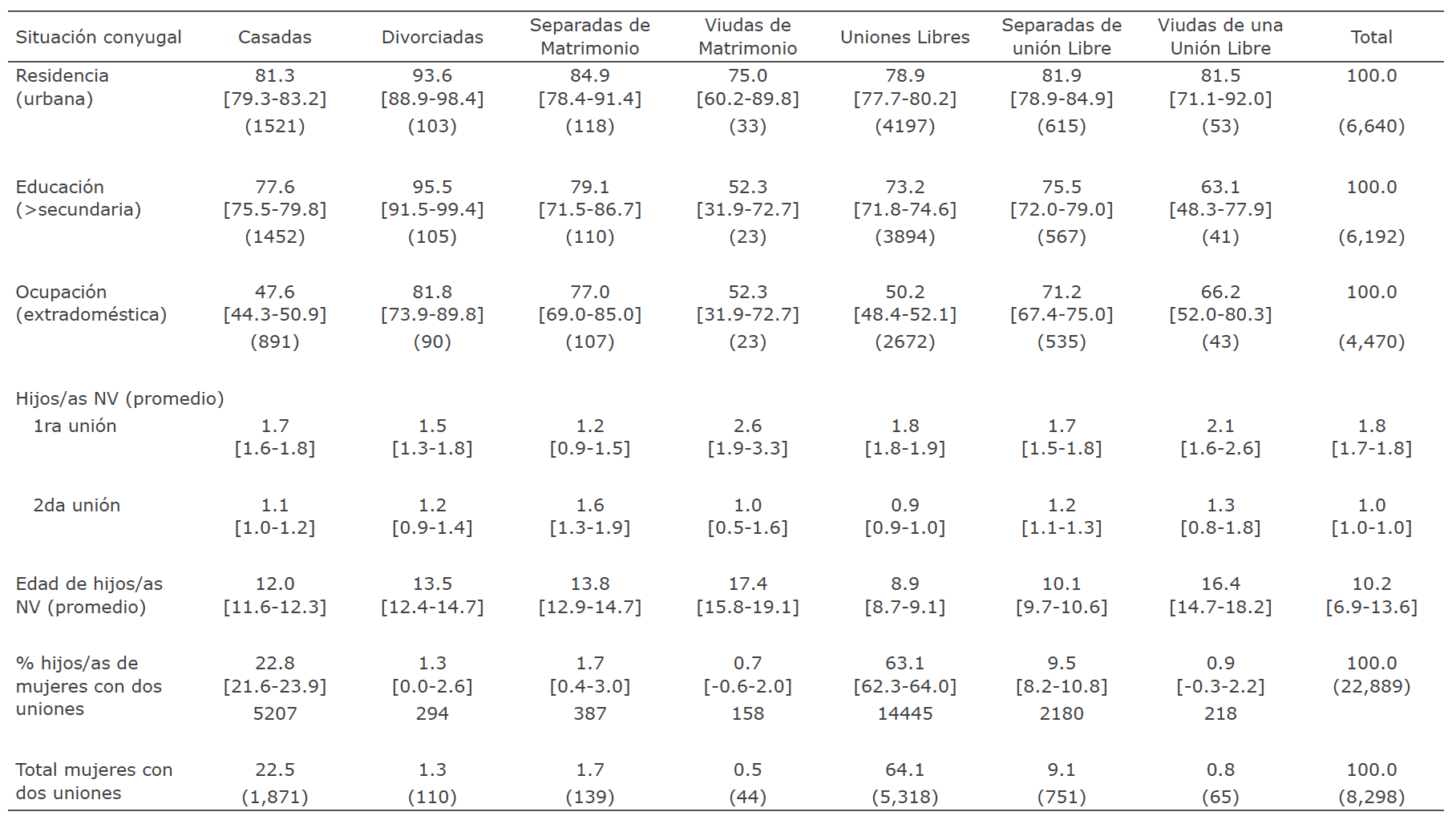 Cuando consideramos además del tipo de unión, la causa de ruptura se observa que entre las mujeres separadas, divorciadas o viudas prima la residencia urbana. Adicionalmente de ello, sus niveles educacionales superan a los de las casadas y en uniones libres que no han visto interrumpidas sus uniones. Los niveles educacionales y de participación laboral de las viudas son marcadamente inferiores —muy probablemente, por contar con una estructura de edades más envejecida y probablemente por tener hijos / as que las mantienen— que los de las mujeres en uniones disueltas por causa voluntarias. La participación extradoméstica es en general alta, superior al 70 %. Cabe señalar que las características de la mujer divorciada en segundas nupcias son distintas a las del resto de mujeres en uniones disueltas. Residen más frecuentemente en áreas urbanas con más de 2,500 habitantes (93.6 %), sus niveles educacionales son superiores al resto (secundaria o más 96.5 %), así como su participación ocupacional fuera del hogar (81.8 %).