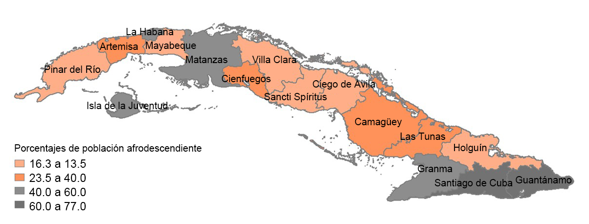 Las provincias donde la población afrodescendiente representa más de 40 % del total son las surorientales Guantánamo, Santiago de Cuba y Granma, destacan también, pero en menor medida las occidentales Matanzas, la capital del país —La Habana— y el Municipio Especial de Isla de la Juventud (Cuadro 1). Hay que señalar que Guantánamo y Santiago de Cuba son las de mayor proporción de población afrodescendiente con un porcentaje superior a 70 % seguidas de Granma con un porcentaje solo algo inferior.