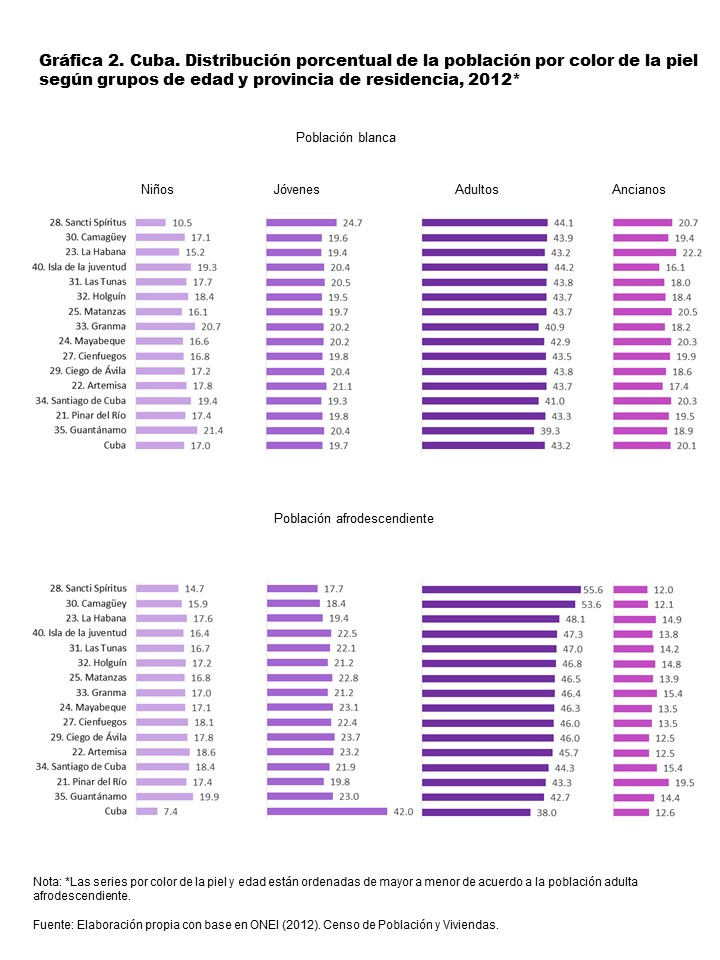 A nivel provincial, en Guantánamo se observa el mayor porcentaje de niños blancos (21.4 %) y afrodescendientes (19.9 %); a su vez, en Sancti Spíritus (24.7 %) y Ciego de Ávila (23.7 %) se ubican los mayores porcentajes de jóvenes blancos y afrodescendientes. En el caso de la población blanca y afrodescendiente adulta, la Isla de la Juventud (44.2 %) y Sancti Spíritus (55.6 %) tienen los mayores porcentajes. Por último, los mayores porcentajes de población de la tercera edad se encuentran en el caso de las personas de piel blanca en La Habana (22.2 %), y para las personas afrodescendientes en Pinar del Río (19.5 %) (Gráfica 1).