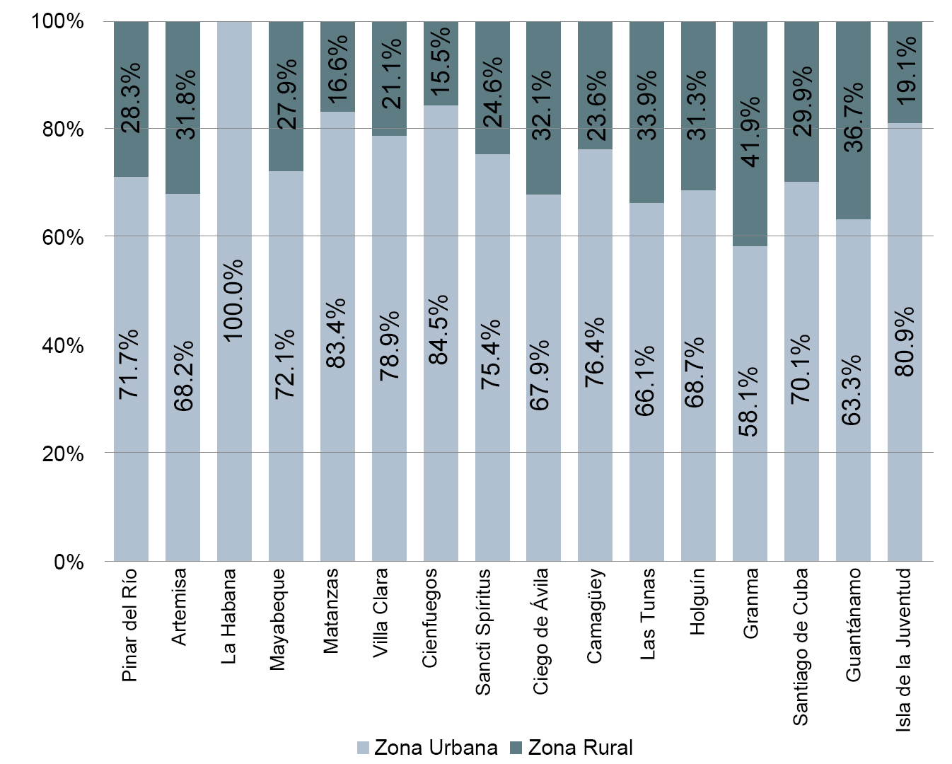 Fuente: Elaboración propia con base en ONEI-CEPDE (2016). Censo de Población y Viviendas 2012.El proceso de colonización impidió que los afrodescendientes poseyeran tierras, por lo que esta población se vio obligada a emigrar sobre todo a las zonas urbanas, lo que refleja elevados índices de urbanización no blanca en dichas regiones y un significativo número de cubanos desposeídos de tierras particularmente en las provincias surorientales de la isla como se aprecia en la Gráfica 2.8