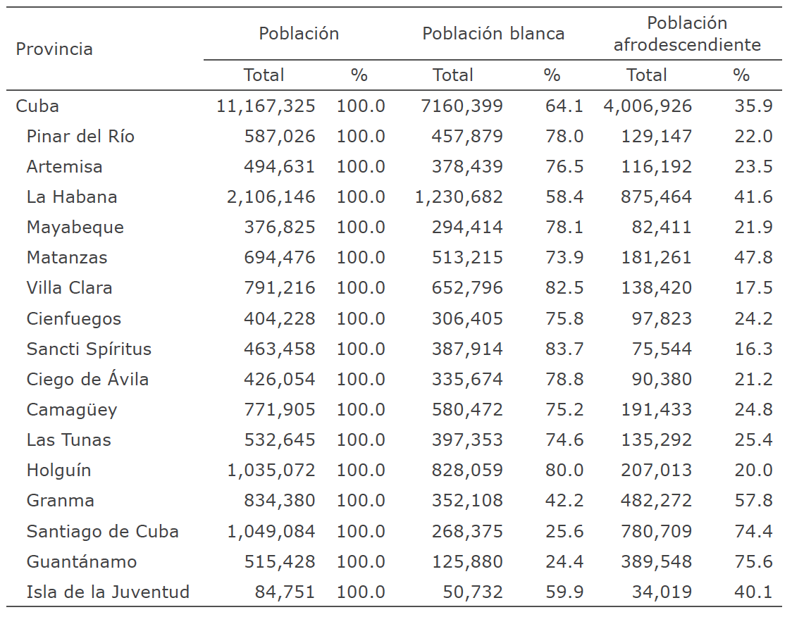 De acuerdo a la División Política Administrativa, Cuba se conforma por 15 provincias, además del llamado Municipio Especial de Isla de la Juventud. La distribución de la población según el color de la piel en 2012 muestra que hay diferentes proporciones de población afrodescendiente en las distintas provincias de la Isla (Cuadro 1). Del total de 11,167,325 habitantes (ONEI-CEPDE, 2012), 4,006,926 son personas que se presentan con color de piel referido. Debe tenerse en cuenta que la población con ascendencia africana es relativamente elevada en algunos contextos regionales del país, ya que representa 35.9 % de la población total y cerca de dos terceras partes (64.1 %), la población blanca.