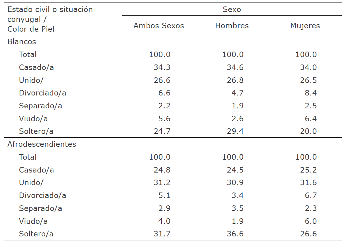 Considerando tan solo a la población casada o unida consensualmente, esta última categoría es la más frecuente en todos los grupos de color de la piel, pero es sobre todo la señalada por la población de cualquier sexo y color de la piel (afrodescendientes con cerca de 68 %), en tanto la población blanca, hombres y mujeres, declaran más una formalización de sus relaciones.