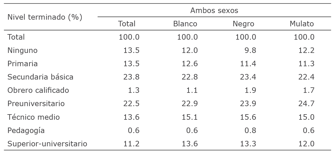 Se cuenta con cifras (Censo de Población, 2012) que apuntan a niveles de educación similares para todos los llamados grupos étnicos en Cuba, lo que haría reconocer que no hay diferenciación social, que existe igualdad de posibilidades de alcanzar un determinado nivel educacional si se es afrodescendiente o blanco. Ello será analizado, de forma somera, en el siguiente apartado.