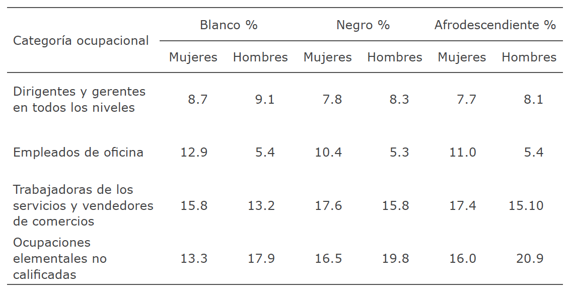 Por categorías ocupacionales se observa que los dirigentes blancos superan a los afrodescendientes, aunque no de forma muy relevante. Esto se aprecia con claridad si se toma en cuenta que los dirigentes blancos dominan a los afrodescendientes y que, a su vez, los blancos ocupados representan 63.2 % de la PEA y el resto de la población 36.8 %, lo que puede denotar una situación menos favorable para estos últimos al ocupar menos cargos de dirección.