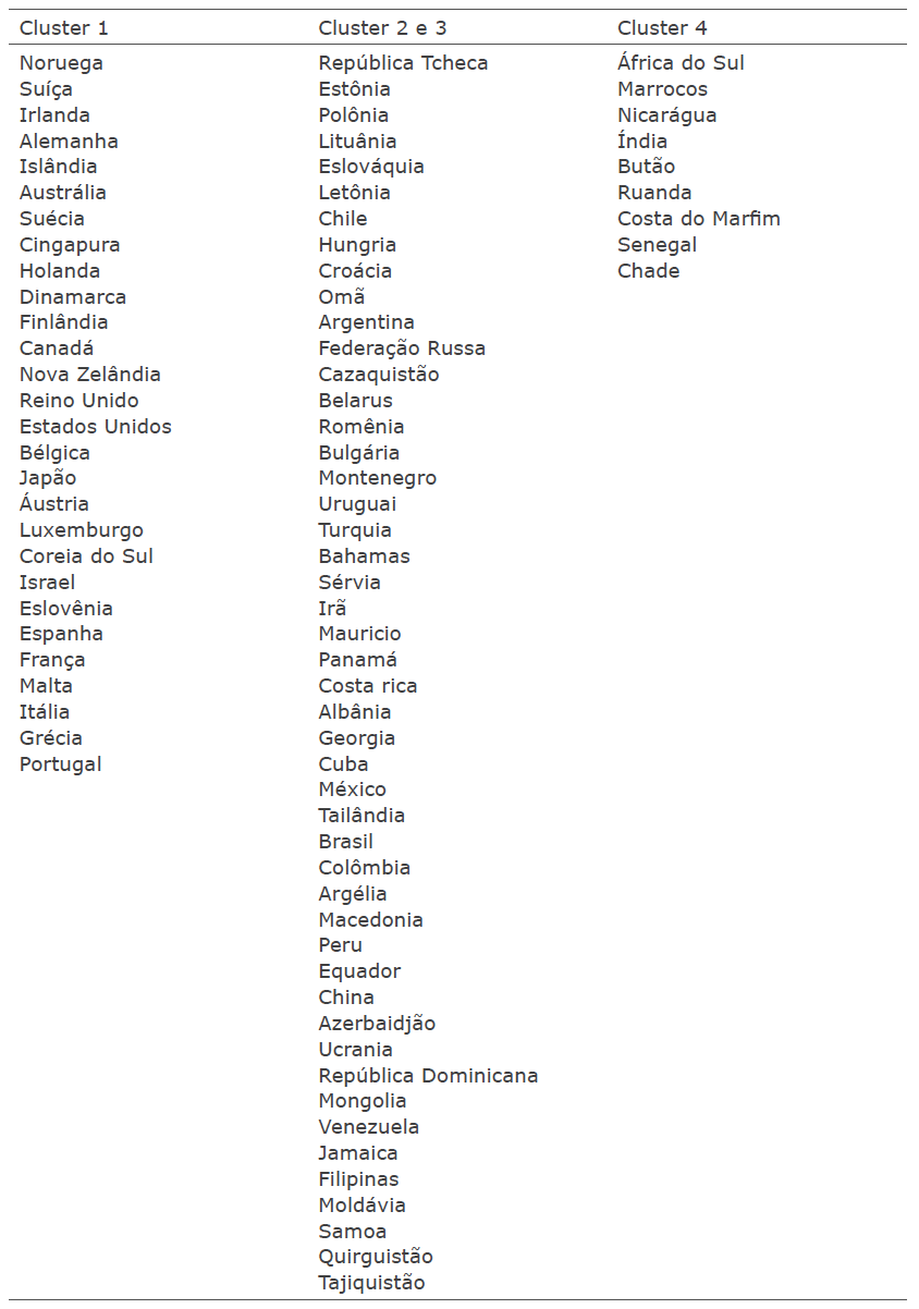 A fim de proceder a proposta de classificação, a partir da construção de intervalos de valores dos três indicadores selecionados, a princípio realizou-se a análise de agrupamento, com a qual foram estimados quatro clusters, utilizando a distância euclidiana ao quadrado, através das cinco variáveis estudadas, entre os 85 países selecionados, conforme indicado na Tabela 3 entre parênteses ao lado da identificação da cada um dos 85 países.